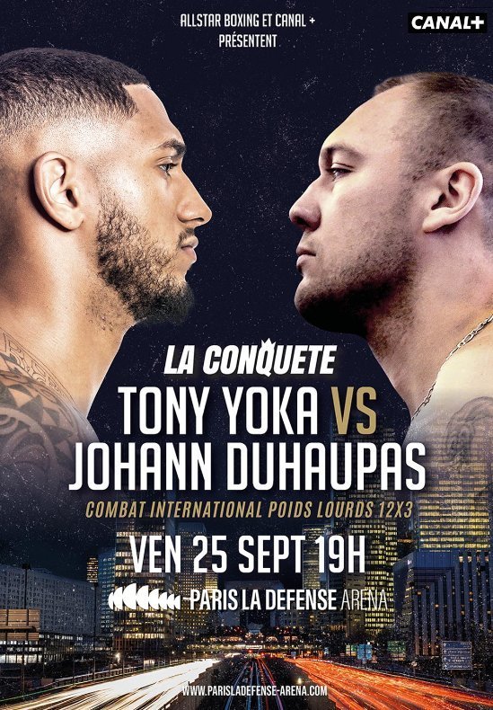 Tony Yoka, alias La Conquête, est la locomotive française de la boxe du haut de ses 28 ans. Champion du monde amateur en 2015 et champion olympique en 2016, il vise le sacre suprême chez les professionnels et une victoire contre Duhaupas lui permettrait d'éventuellement se placer pour un combat pour le titre en 2022.