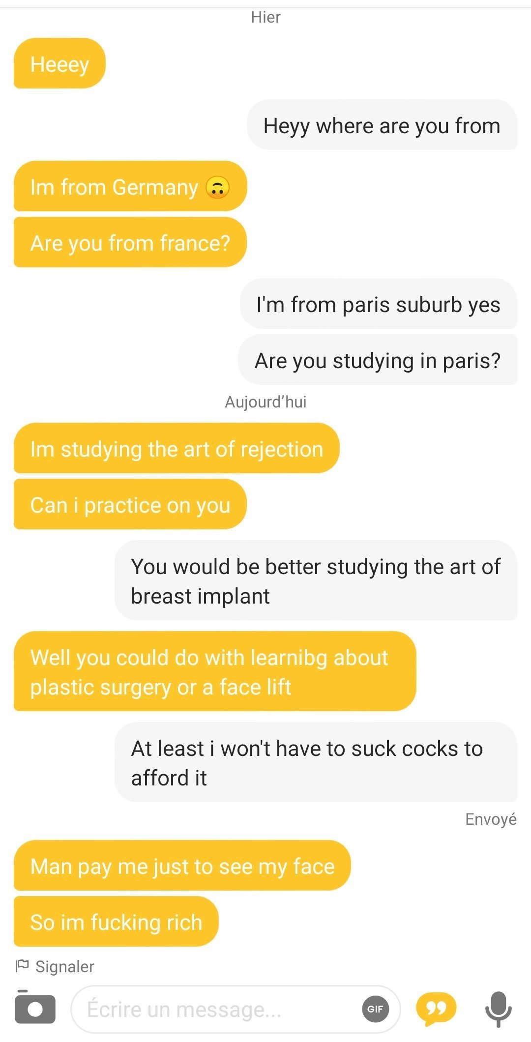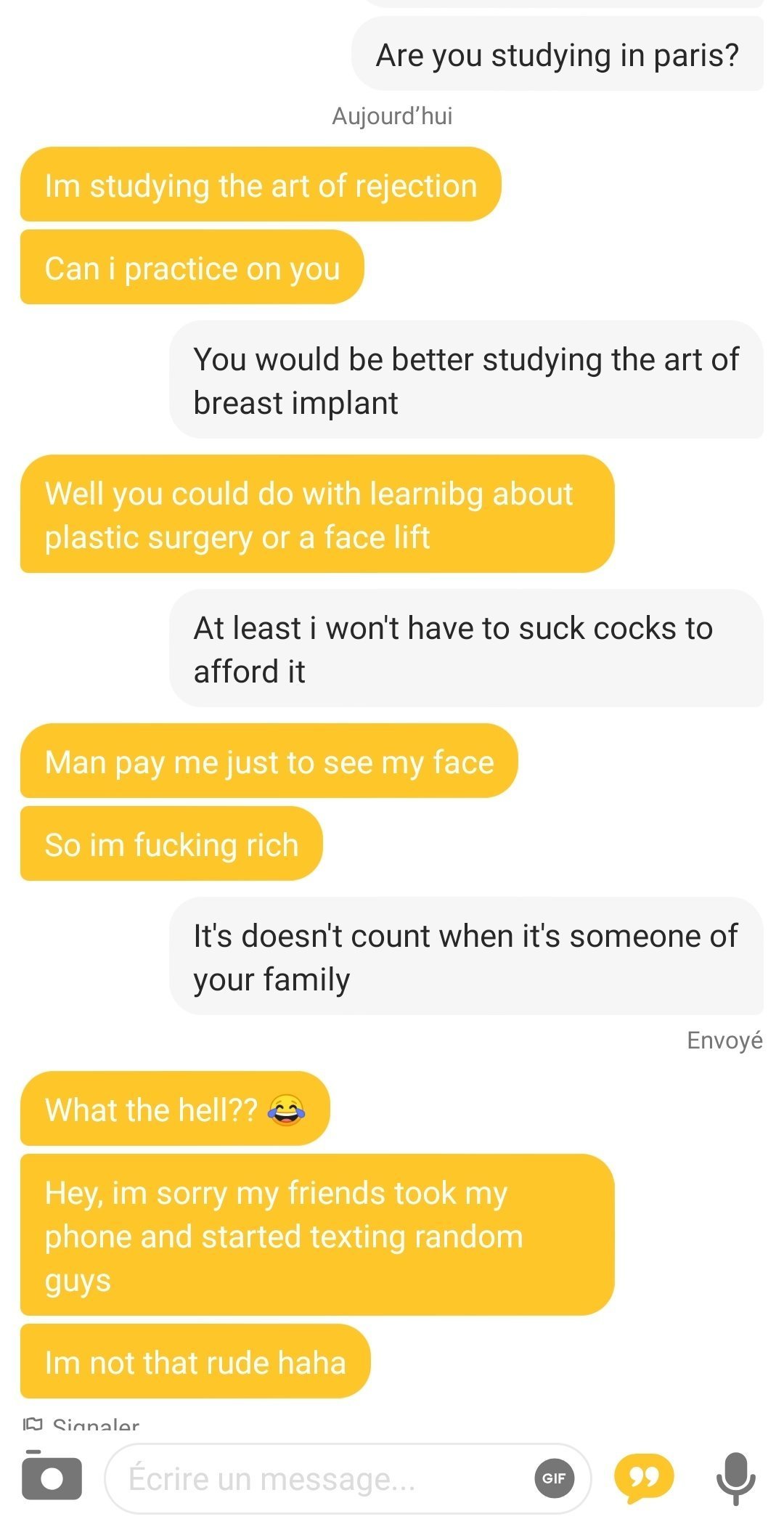 Le 04 octobre 2020 à 22:00:43 Drivaxaxe a écrit : je dis quoi? "Darling at least i won't have to suck somebodys dick to afford it "