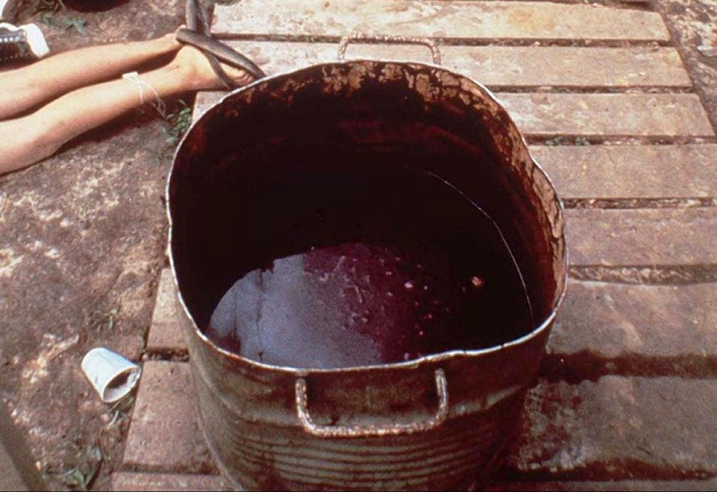 Suite à ça jones sait qu'il est foutu, l'armée va finir par débarquer assez rapidement et il lance alors le plan de suicide collectif qu'il avait déjà en tête depuis un certains temps.. réunion de toute la communauté au capitole, dernier sermon du pasteur pour les encourager à se suicider puis il remplissent des bassines de cyanures, de somnifères et de jus de pomme et commencent à en donner au enfants avec des seringues dans la bouche