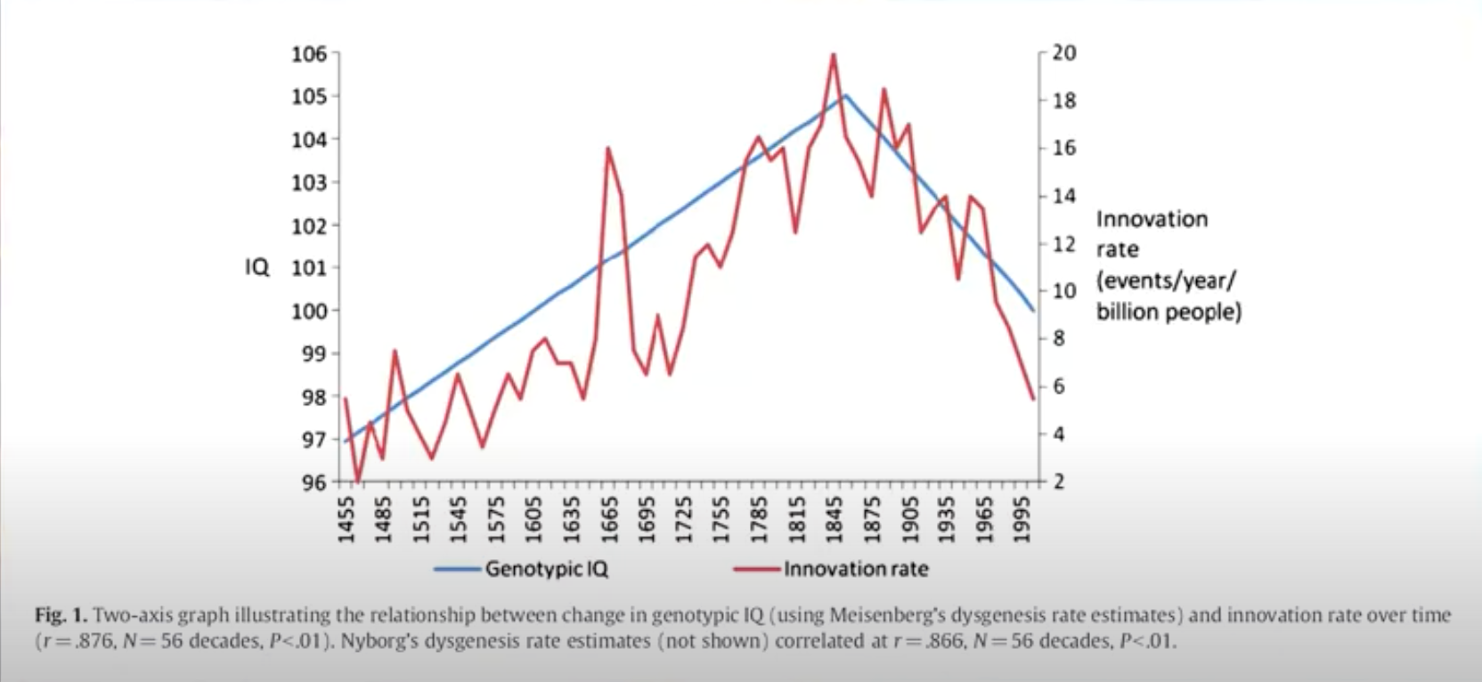 Dans Human Accomplishment: The Pursuit of Excellence in the Arts and Sciences, Charles Murray montre que le pic de génies par habitants a été atteint en 1825, et ne cesse depuis de décroître.
