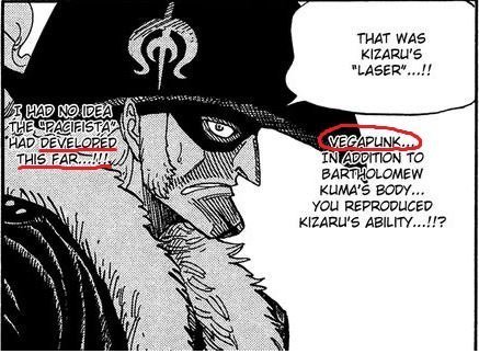 • Cependant, lorsque Franky a été envoyé sur l'île Karakuri, et a pu s'introduire dans le laboratoire secret de Vegapunk, ou se trouve plusieurs plans, des schémas etc. Il a pu se construire une main pouvant tirer des lasers, des lasers assez similaires à ceux des Pacifistas. Là où je veux en venir, c'est qu'il n'a pas eu besoin de Kizaru pour obtenir ce pouvoir.