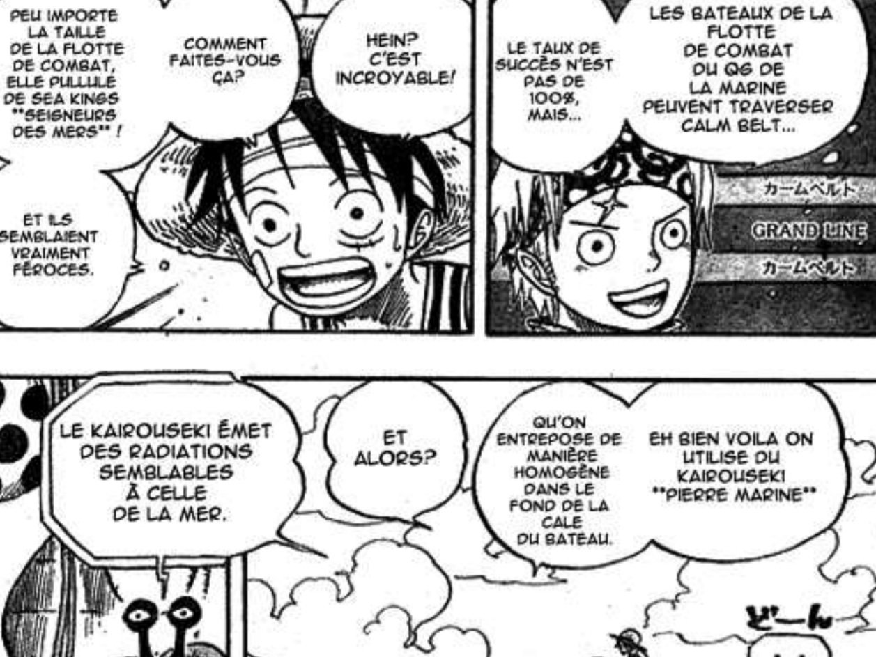 Une invention donc récente, et qui n'existait pas auparavant.Mais notamment, elle permet aux navires de guerre de traverser Calm Belt, sans se faire repérer par un monstre marin. Et cela en recouvrant la coque du navire de cette substance.