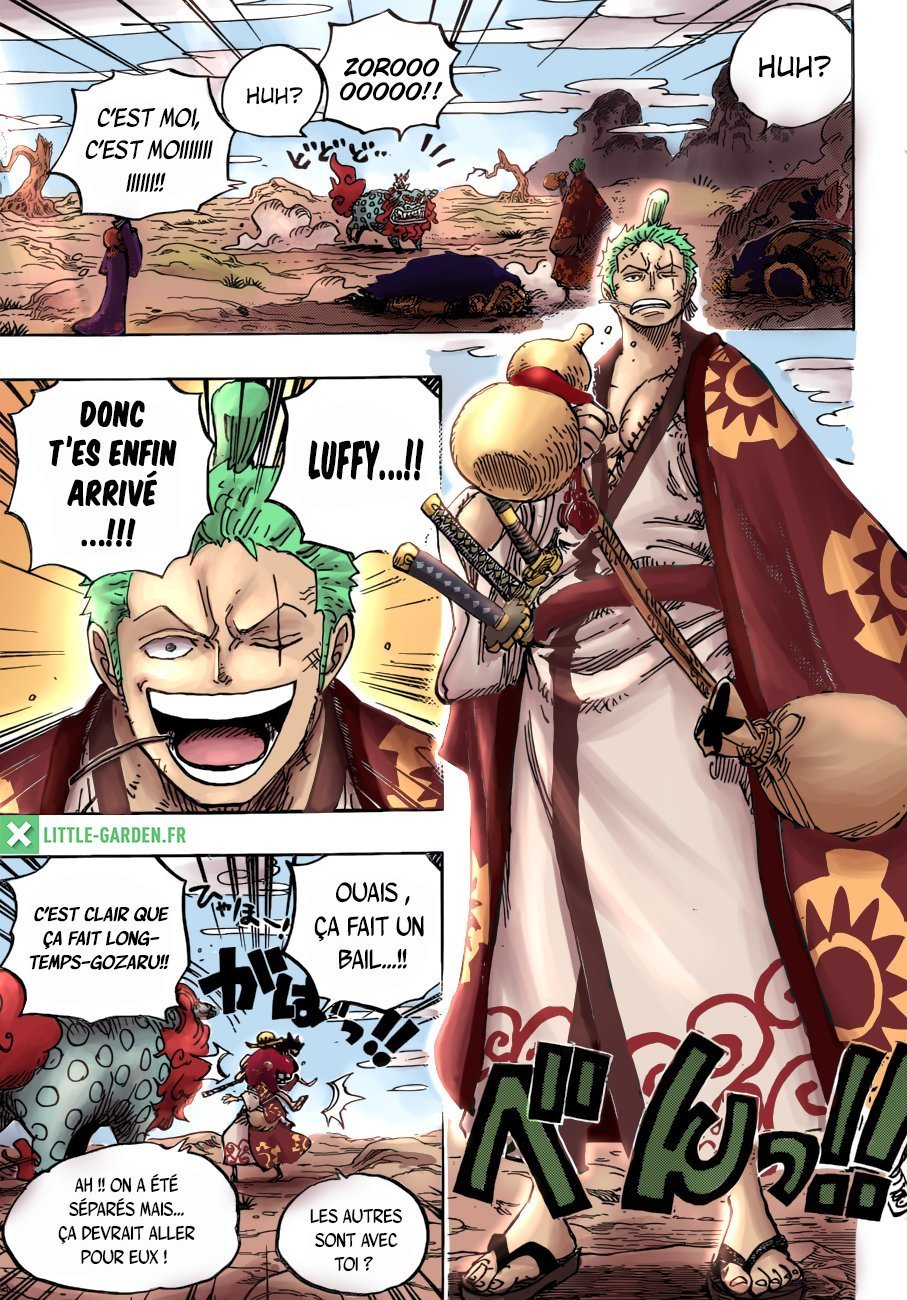 Et Zoro je le met là pour son duel avec le gardien du pont, qui déchirait et qui était un moment excessivement films de samurai + va sûrement se taper Komurasaki et avoir de gros moments dans la baston contre Kaido et Big Meme
