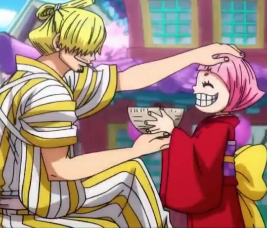 : On parle beaucoup de la complicité Chopper/Zoro mais celle de Sanji/Chopper marche aussi, on remarque qu'il y a une présence protectrice et rassurante, on constate la même chose avec Momo qui se refugie près de Sanji.