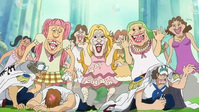 Oda qui s'enfonce toujours plus dans la décadence alors que pendant ce temps la tous les mugi sont encore puceaux, et ça n'a rien à voir avec les clown de l'ile des trans puisque que chez eux certains n'agissent pas comme des femmes et quand c'est le cas on voit clairement par leur disign que ce sont des hommes.