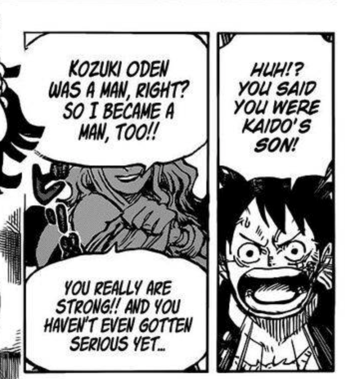 non elle l'explique à Luffy sa volonté de se faire passer pour un homme par rapport a sa volonté d'etre Oden qui est un homme !
