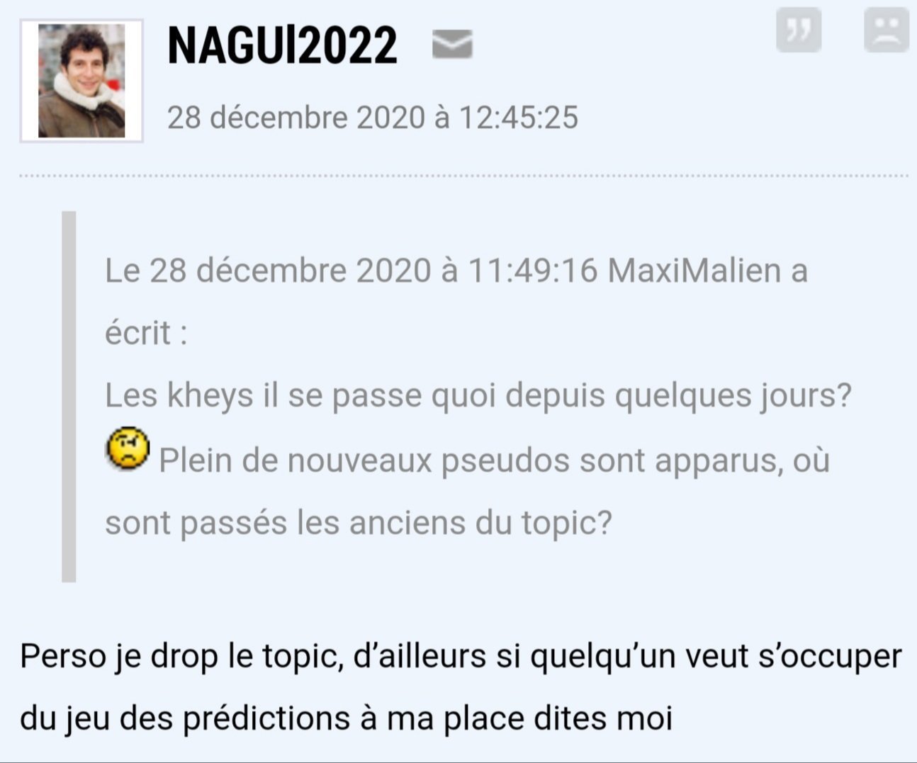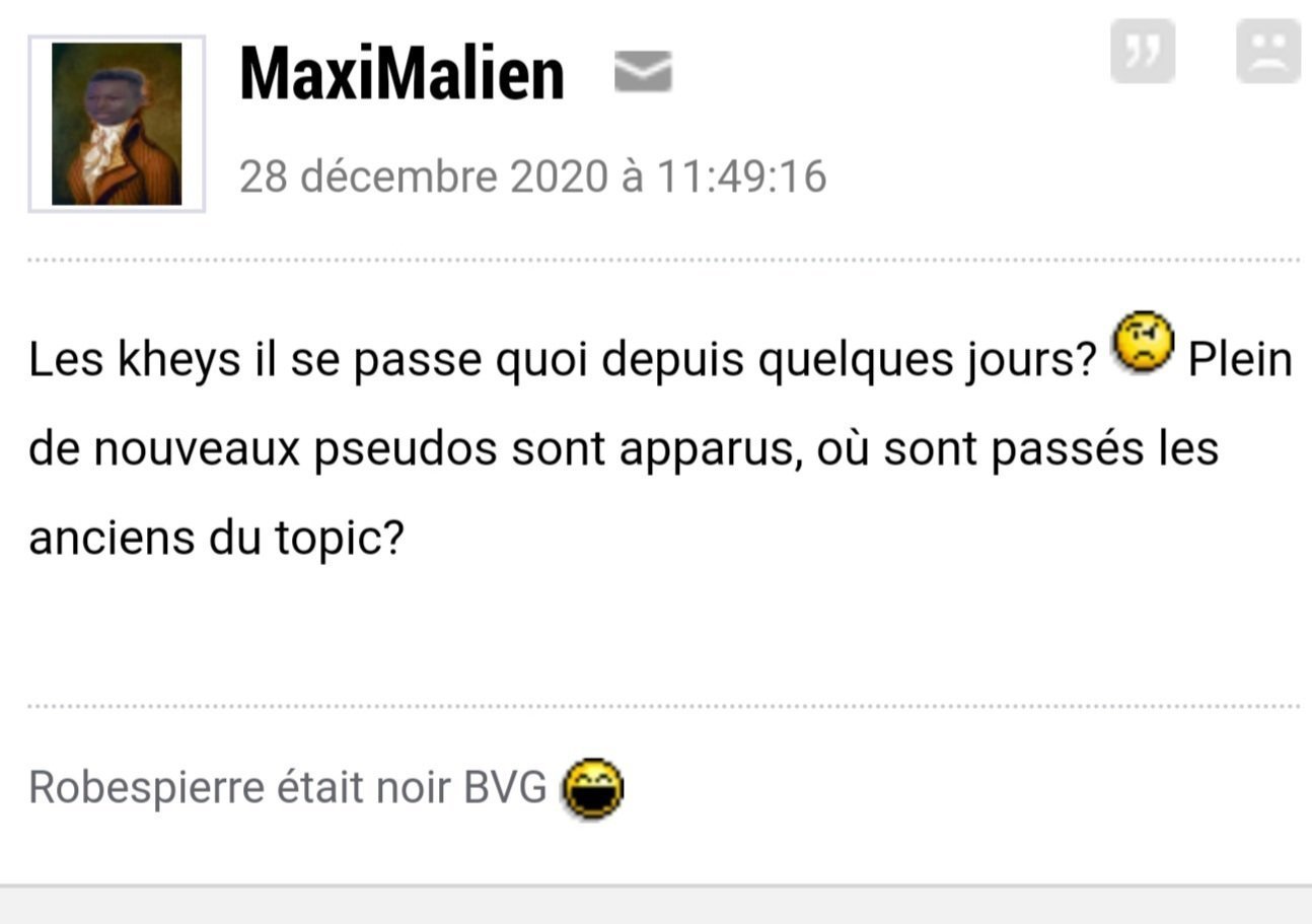 Maximalien est un ghost qui a été actif à un moment, mais ce que je voulais dire ce qu’il représente pas l’avis de l’ensemble des kheys du topic