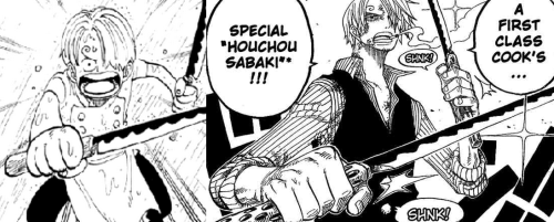 Sanji va s'occuper du gros cul de Queen et ensuite aider Zoro en lui montrant comment s'effectue la découpe d'une carpe.