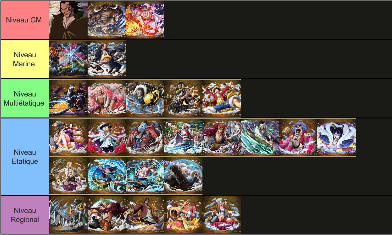 PS : Les protagonistes sont classés à leur prime, raison pour laquelle Doflamingo est toujours dans les hautes sphères