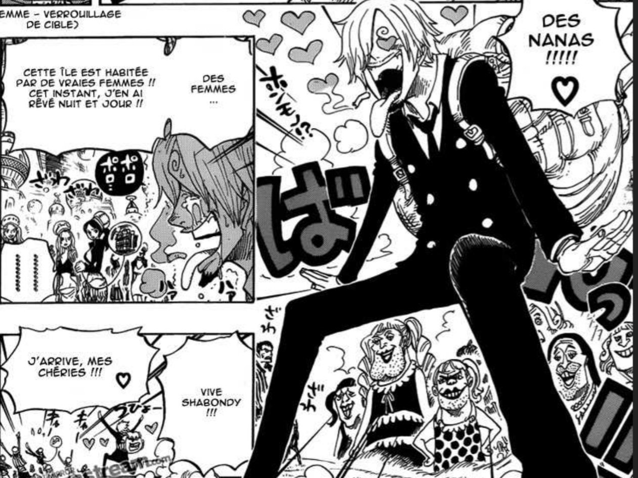 Visiblement Sanji aime bien les robes et le maquillage. Et dire qu'au chapitre 595, il avait peur pour sa " virilité ". Jolie contradiction.