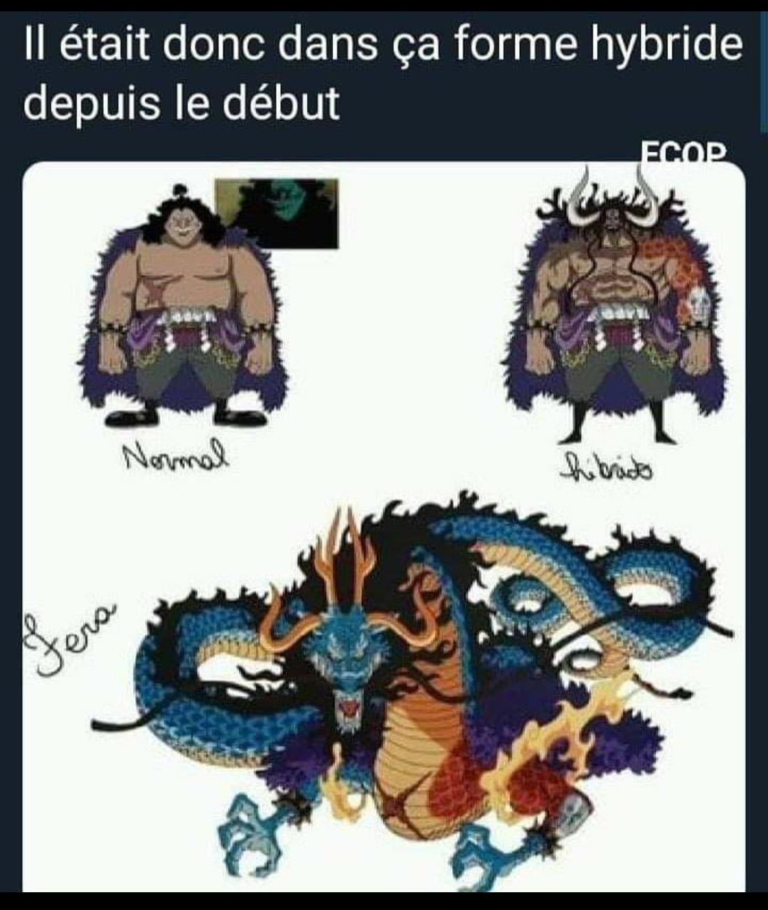 Je pense qu'en réalité kaido est moins impressionnant que ça et que la silhouette qu'on voyait au départ est ça vrai apparence.