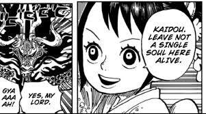 - Nekomamushi sulong utilise l'attaque "AKABYOBU" (danse du chat rouge) sur Kaido au niveau de sa gueule