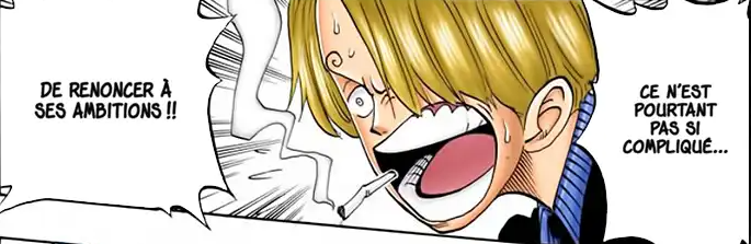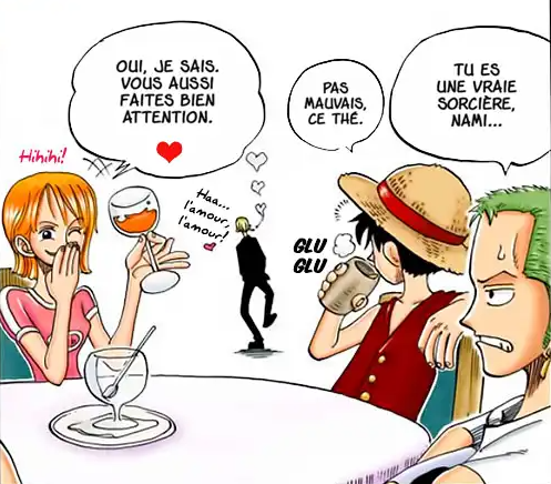 Ensuite, après que Nami arrive à avoir le menu gratuit par le gentleman de Sanji, on aperçoit Zoro se plaindre que Nami est une vraie sorcière, toujours avec une goute, cette fois ci sur le front, comme si il était encore gené par la présence de Sanji, ce dernier lui, part en disant "haaa.. l'amour, l'amour !" de qui parle t-il ici ?