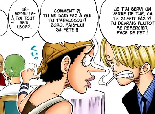 Commençons par le commencement, au chapitre 46, Zoro et Sanji ne parlent pas encore ensemble mais dans cette scène on voit très bien que Zoro ne souhaite pas défendre Usopp et nous pouvons voir une goutte qui tombe de sa douce chevelure verte, comme si il était gené par la présence de Sanji