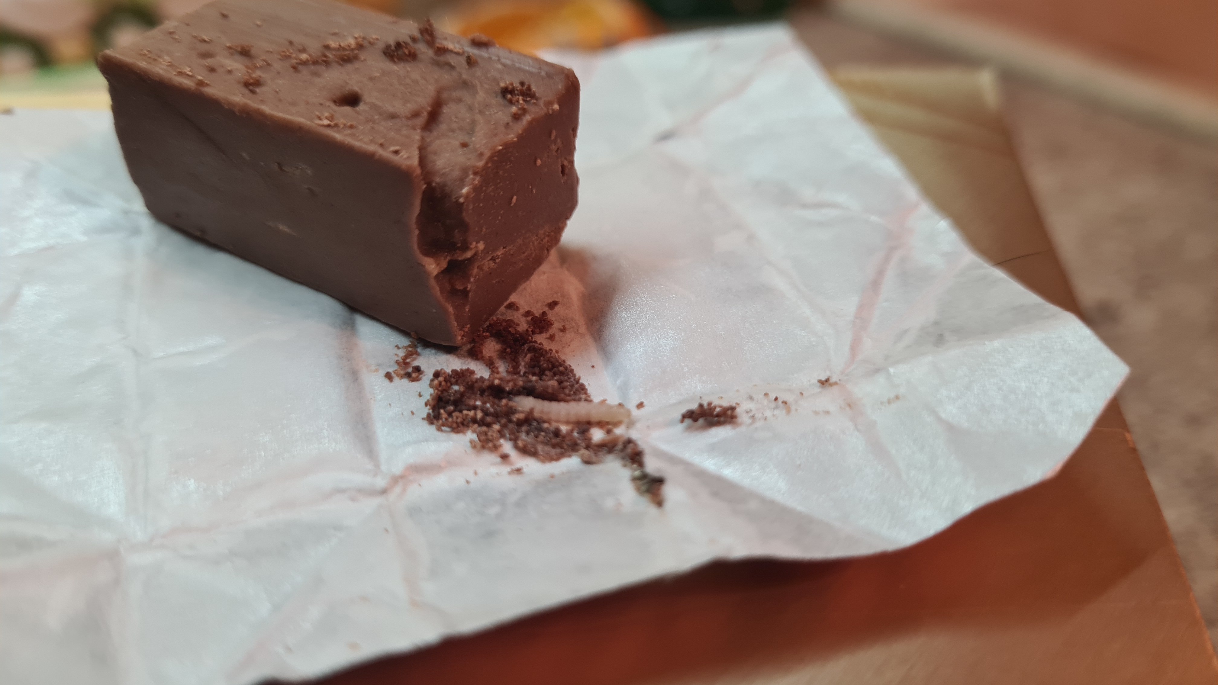 de quoi tu parles ? Tu crois que le ver est entré dans la boite et dans l'emballage du chocolat comme un grand ?