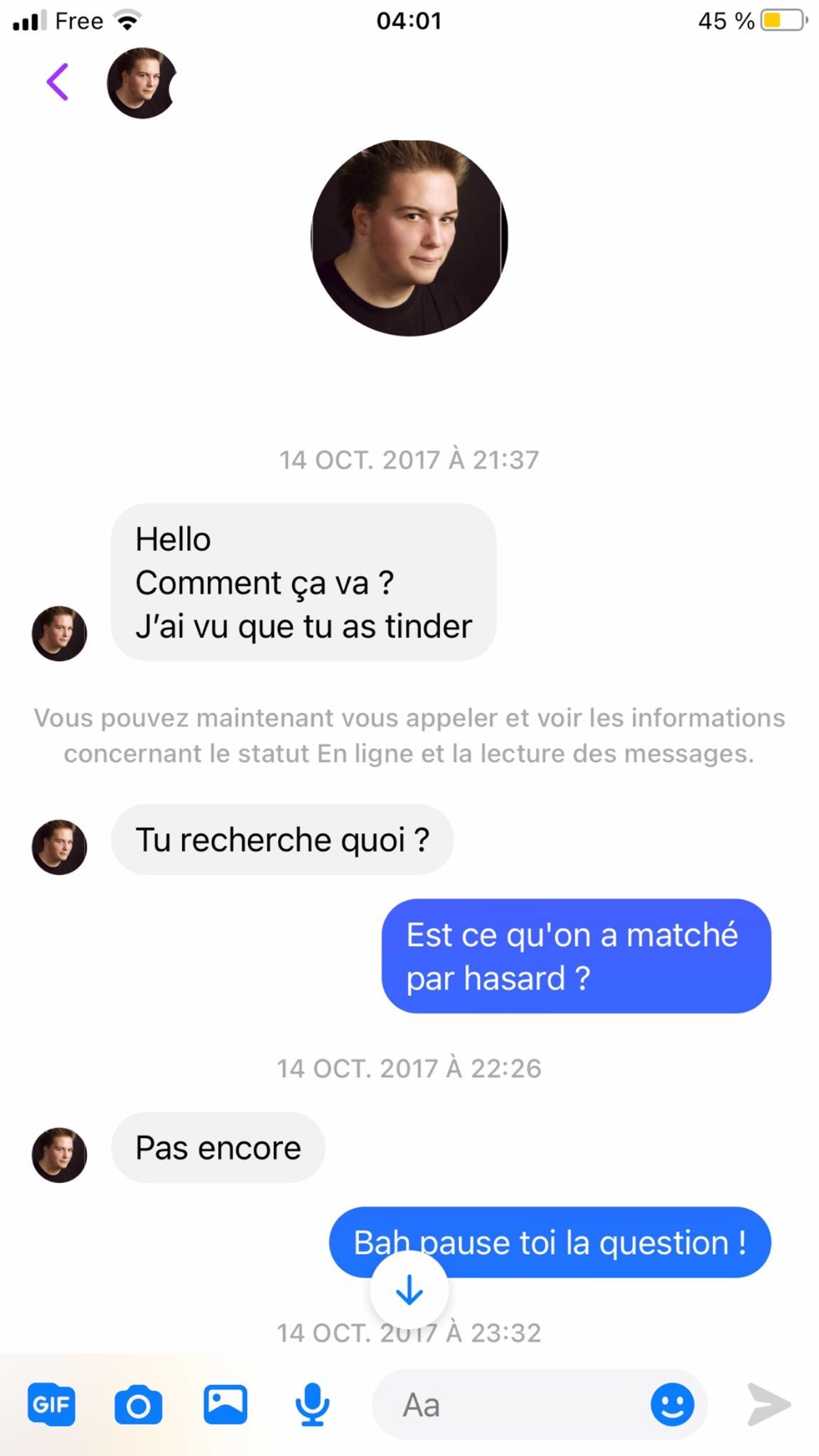 Pardon j'avais la flemme de remonter dans la conversation alors j'ai répondu à ton post. Je faisais référence à l'image. Elle lui dit "est ce qu'on a matché sur Tinder ?", il répond " Pas encore". Genre le mec il a encore un espoir. Le pauvre.