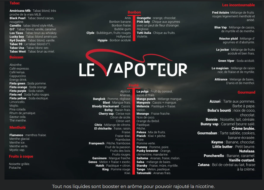 y'a une boutique qui fait ses liquides maison et vend aussi des liquides d'autres marques mais y'a beaucoup trop de choix ! Voici la carte mais y'en a plus en magasin :