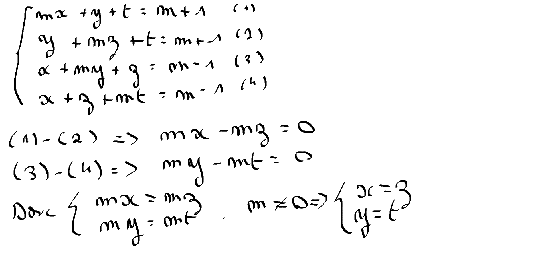 4 variables et 2 équations à priori tu as une infinité de solutions De toute façon tu as que 3 cas possibles : - 0 solutions - 1 solution - une infinité de solution