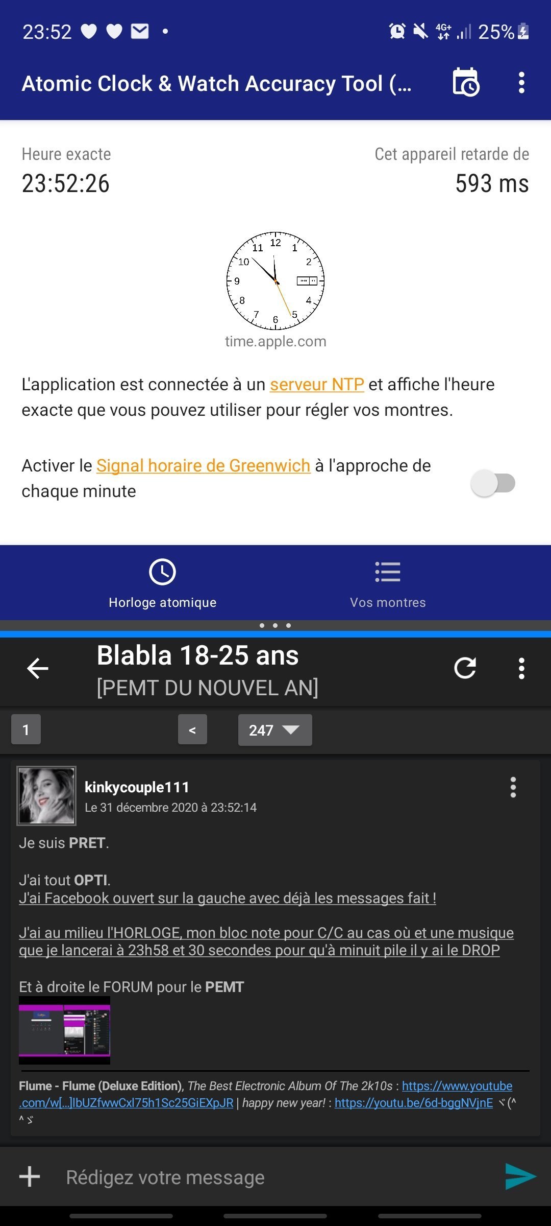 J'ai au milieu l'HORLOGE, mon bloc note pour C/C au cas où et une musique que je lancerai à 23h58 et 30 secondes pour qu'à minuit pile il y ai le DROP