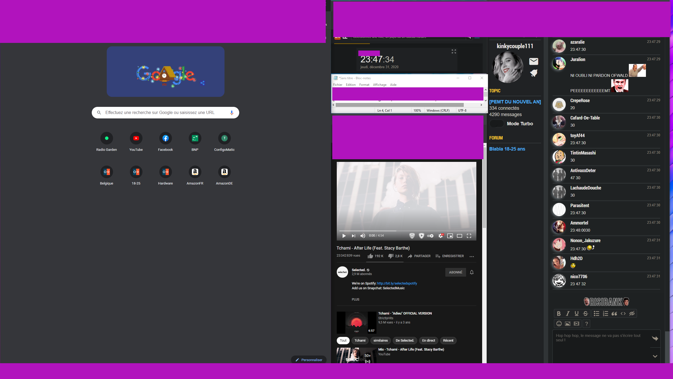 J'ai au milieu l'HORLOGE, mon bloc note pour C/C au cas où et une musique que je lancerai à 23h58 et 30 secondes pour qu'à minuit pile il y ai le DROP