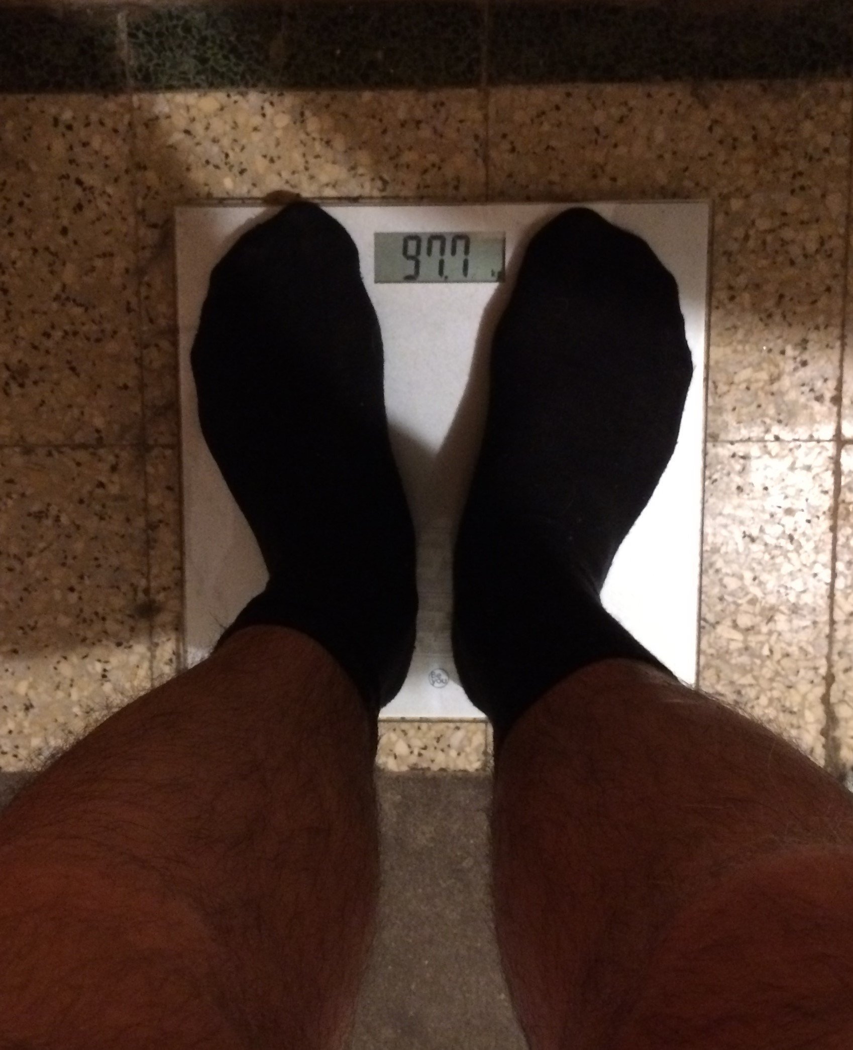 Bon je me suis pesé ce matin, 97.7, soit 1,8 kg en moins. C'est mieux que ce que je craignais sans être exceptionnel pour autant. J'en retiens néanmoins deux avantages : celui du total du poids perdu depuis mes trois semaines de régime (11kg3), et la distance m'éloignant un peu plus de la barre des 100 kilos (2kg3).
