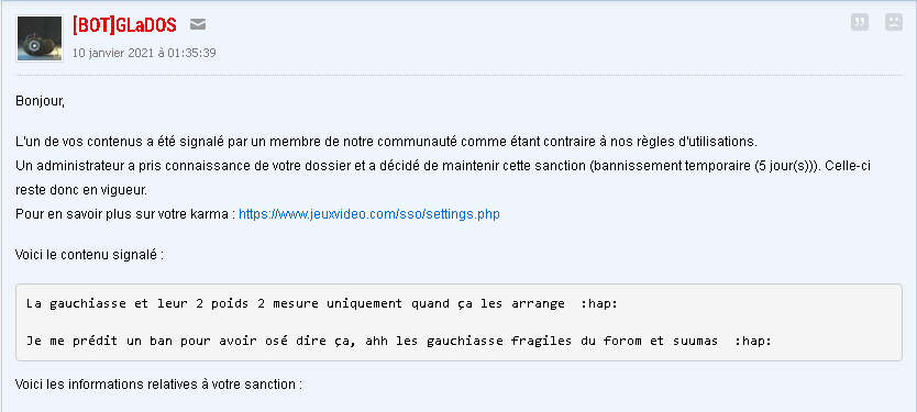 Le 10 janvier 2021 à 02:03:09 HVirguleH a écrit :t'as pas le droit de parler mal de la guache, cela s'appelle la liberté d'expression
