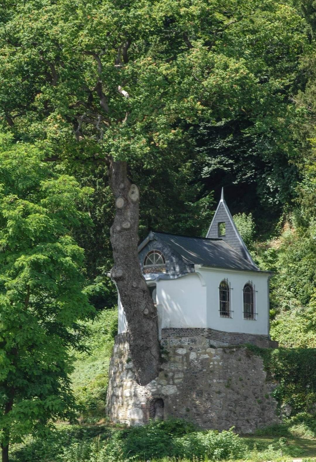 Amenés à débroussailler les quatre terrasses surplombant le Château de la Ronce pour y créer un verger, deux ouvriers bûcherons ont découvert en 1842 dans une anfractuosité du chêne une statue de la Vierge Marie dont personne n’avait entendu ouï dire. Ils la cachèrent de manière à la protéger et la retrouvèrent miraculeusement à sa place le lendemain matin. Ils coururent chercher le propriétaire Jacques de COLOMBEL qui, très pieux, décida d’y bâtir une chapelle autour du chêne sacré. Elle est aujourd’hui encore restée propriété de cette famille