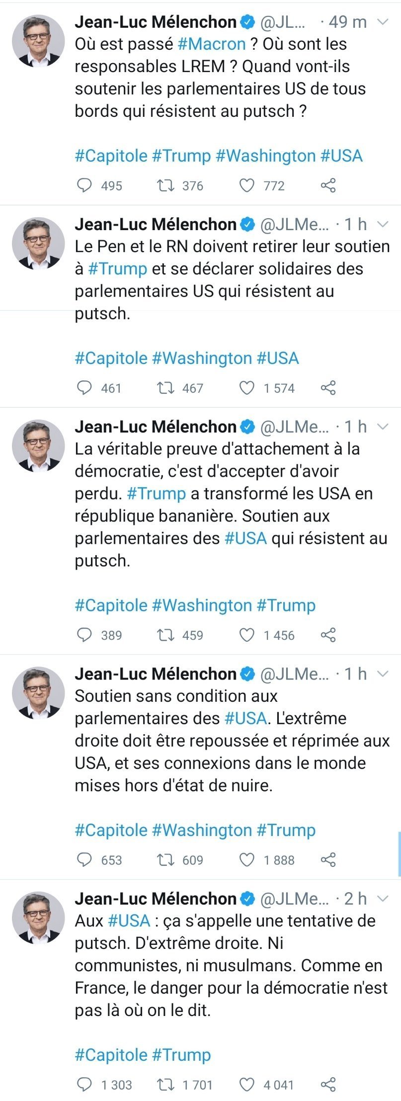 Mélenchon jubile presque de ce bordel, insinue qu'il y a bien eu de la fraude électorale aux États-Unis, que l'Etat fédéral tout entier, donc les Républicains comme les Démocrates, mérite ce moment.