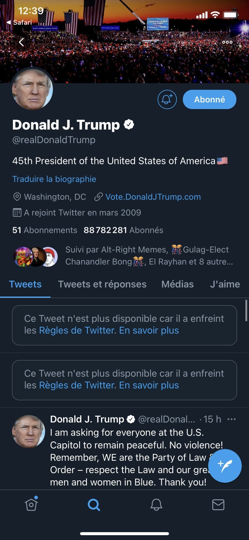 Les patriotes hier ont sauvé les États-Unis. Ils n’auront pas sauvé Trump, mais ils auront fait comprendre à la gauche que, si elle dépassait certaines bornes, la droite était capable de véritable insurrection. Si on ajoute à cela le fait que tous les mouvements de droite ont été bannis de l’internet visible, et que l’on sait combien ils sont néanmoins organisés, on comprend qu’ils sont parfaitement hors radar. Je pense que la présidence suivante va se tenir à carreau, et que l’abominable arrogance que l’on entendait venir, qui voulait changer toutes les règles au profit des démocrates : accroître la Cour Suprême, créer un État artificiel pour augmenter le nombre de sénateurs démocrates, permettre l’invasion migratoire des États républicains du sud, etc., bref, toutes ces velléités arrogantes vont être bien tempérées. Tous les hommes que l’on a vu hier ont un fusil d’assaut chez eux.C'est vraiment le jour et la nuit entre les US et la France n'empêche