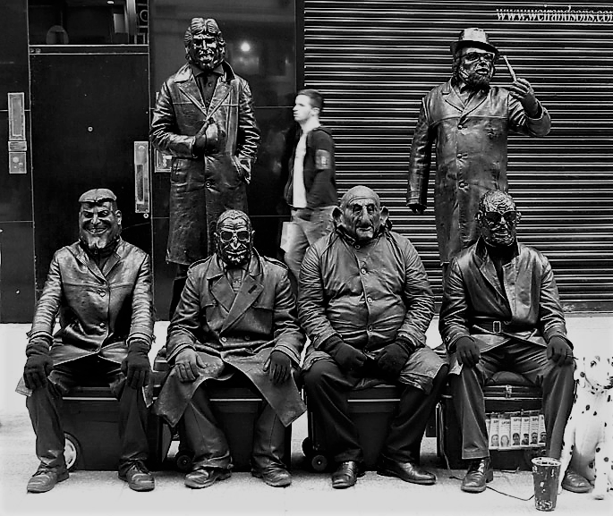 Les gens ont commencé à craindre, le frisson parcourait l’épiderme de la métropole et nous ne mettions pas un doigt dessus. Nous étions inquiets aussi. Il était difficile de s’attaquer à l’animation urbaine. Un aimable divertissement peut cacher un sombre décor. Je pense après coup qu’ils n’étaient que six, et que le septième c’était nous, ou la ville. Ils étaient les murailles au sein desquelles nous nous sommes tous retrouvés prisonniers. Leur présence immobile et angoissante à transformer les rires et l’agitation en une inertie désespérée. Comme la vague ils nous ont happé. Tout le monde s’est plié à leur sombre spectacle et s’est retrouvé forcer à sourire en y abandonnant son cœur.