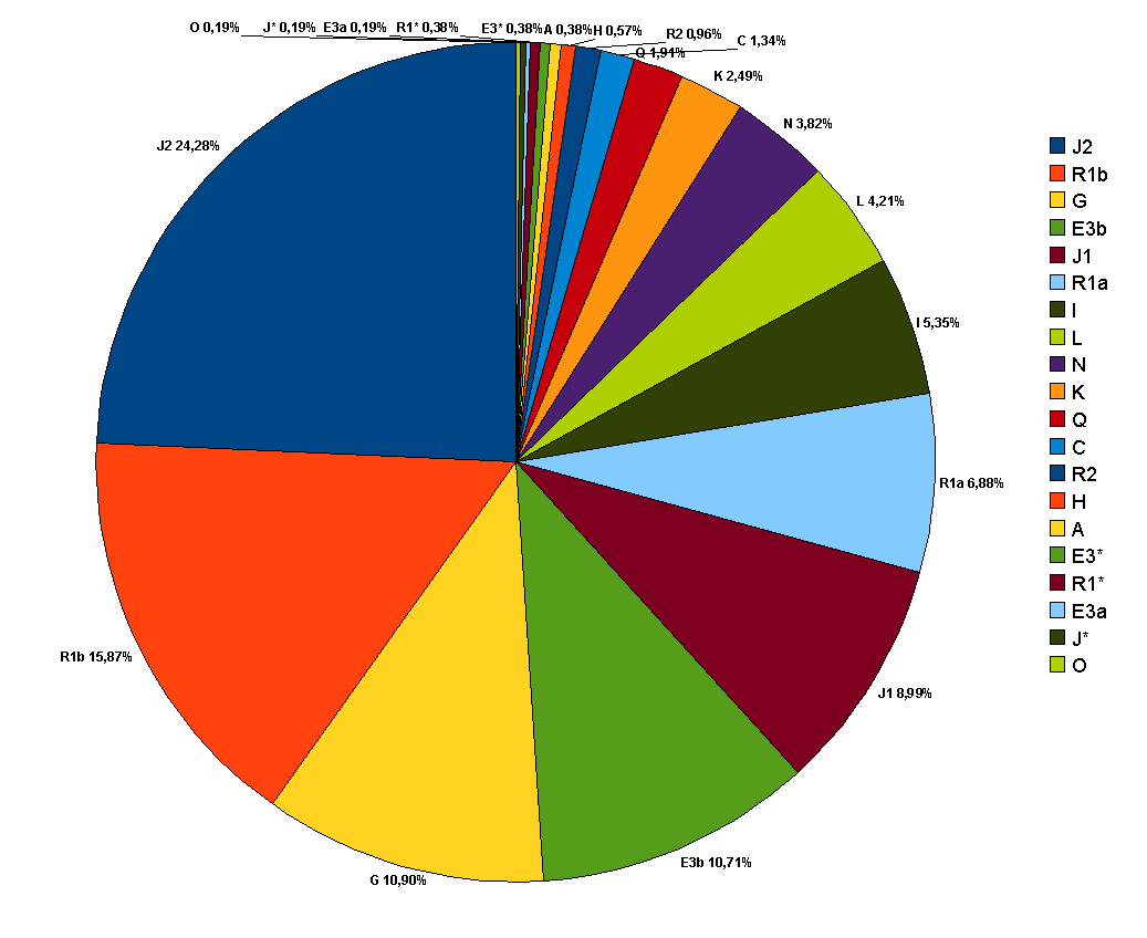 Selon Cinnioğlu et al. (2004), de nombreux haplogroupes d'ADN-Y sont présents en Turquie. La plupart des haplogroupes en Turquie sont partagés avec leurs voisins d'Asie occidentale et du Caucase. L'haplogroupe le plus répandu en Turquie est J2 (24%), qui est répandu parmi les populations méditerranéennes, caucasiennes et d'Asie occidentale. Des haplogroupes communs en Europe (R1b et I - 20%), en Asie du Sud (L, R2, H - 5,7%) et en Afrique (A, E3 *, E3a - 1%) sont également présents. En revanche, les haplogroupes d'Asie centrale sont plus rares (C, Q et O). Cependant, le chiffre peut atteindre 36% si K, R1a, R1b et L (qui se produisent rarement en Asie centrale mais sont notables dans de nombreux autres groupes turcs occidentaux) sont également inclus. J2 est également fréquemment trouvé en Asie centrale, une fréquence particulièrement élevée (30,4%) étant observée en particulier chez les Ouzbeks. Certains des pourcentages identifiés étaient: Etudes génétiques sur les Turcs - https://fr.qaz.wiki/wiki/Genetic_studies_on_Turkish_people