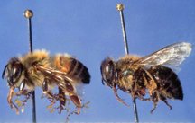 ( à gauche une abeille à miel européenne, à droite une abeille africanisée )