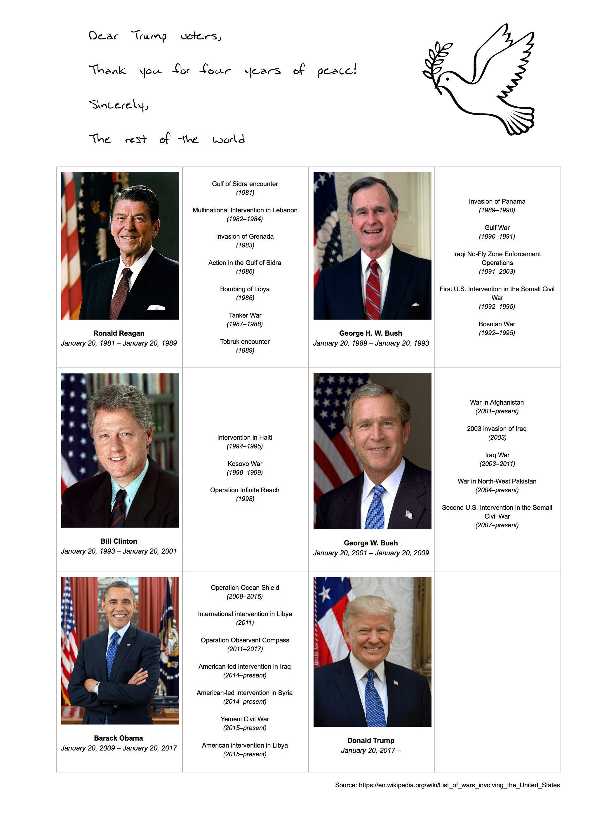 J'ai pas compris, le mandat de Trump en matière d'interventions extérieure se limite à des encarts wikipédia? Il est pas intervenu à l'extérieur?