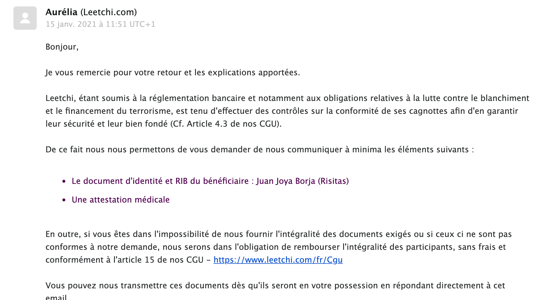 De plus j'ai toujours été réglo, si vous ne me faites toujours pas confiance vous avez entièrement le droit de contacter le support de Leetchi pour leur demander des renseigements. Ils vous rediront exactement la même chose qu'ils ont déjà dit plusieurs fois: la cagnotte est nominative pour Risitas, à aucun moment je ne vais toucher le moindre centime, tout comme Miguel (le pote de Risitas) ou son neveu.