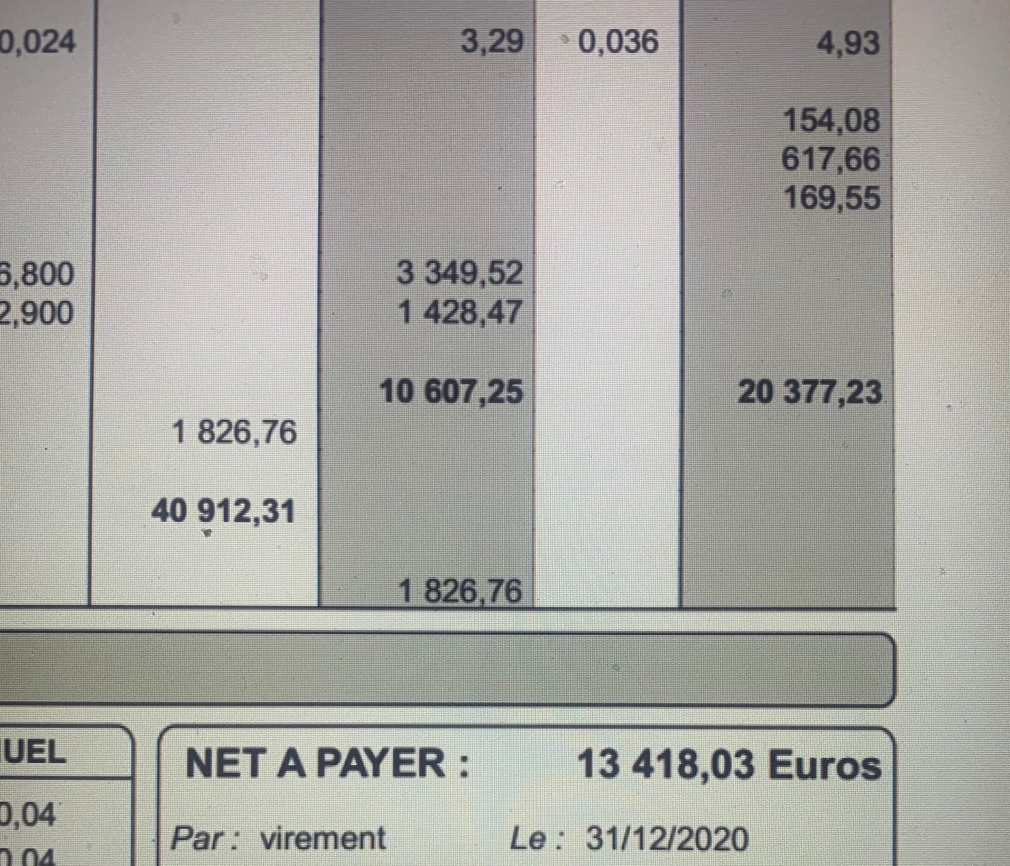Montre le bulletin en entier.J’ai touché 5400€ ce mois ci. Avec le 13e mois, la prime de télé-travail et la rétroactivité de mes augmentations depuis Septembre.