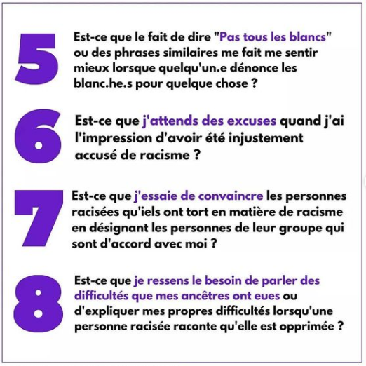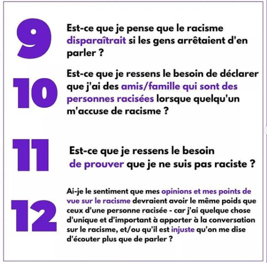 3 - ça dépend sur quels sujet la personne doit parler du racisme. Certaines personnes peuvent interpréter des situations comme racistes, alors qu'il faut souvent appronfondir un contexte souvent négligé.
