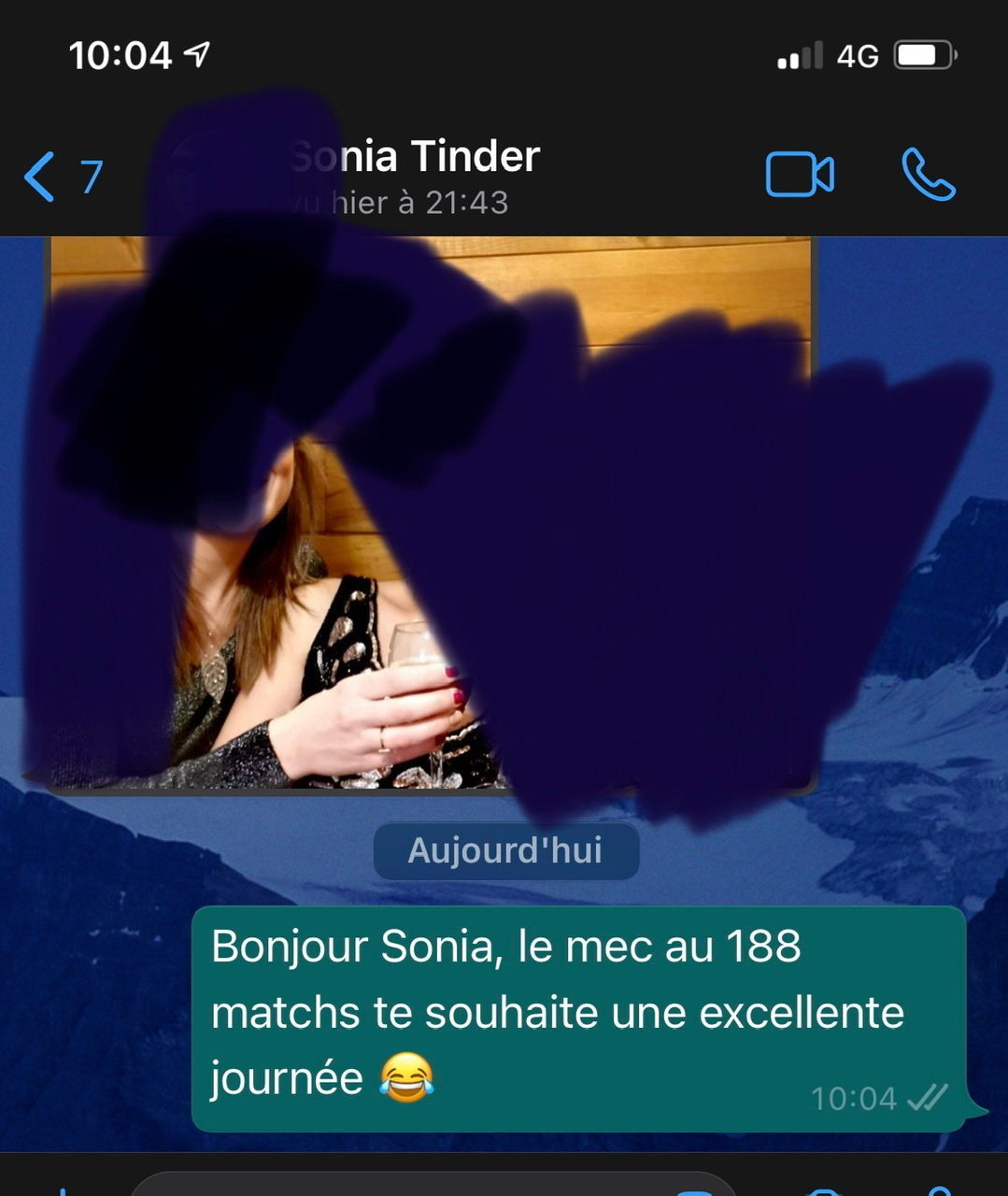 Je rigole avec cette 8/10 bourgeoise de mon nombre de matchs parce que elle m’avait dit : « comment tu fais pour parler à toutes ?! »