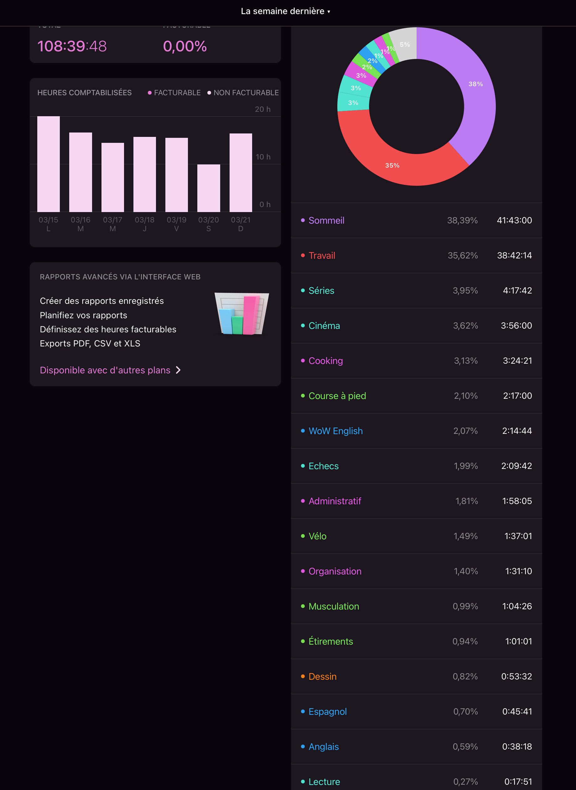 J'ai pas réussi à faire plus cette semaine, même si étonnamment, selon mon application de tracker de temps, j'aurais bossé 41 heures au total. Soit Cned > 21H30 / Prise de note (job étudiant) > 18H30 / Anglais : 1H30