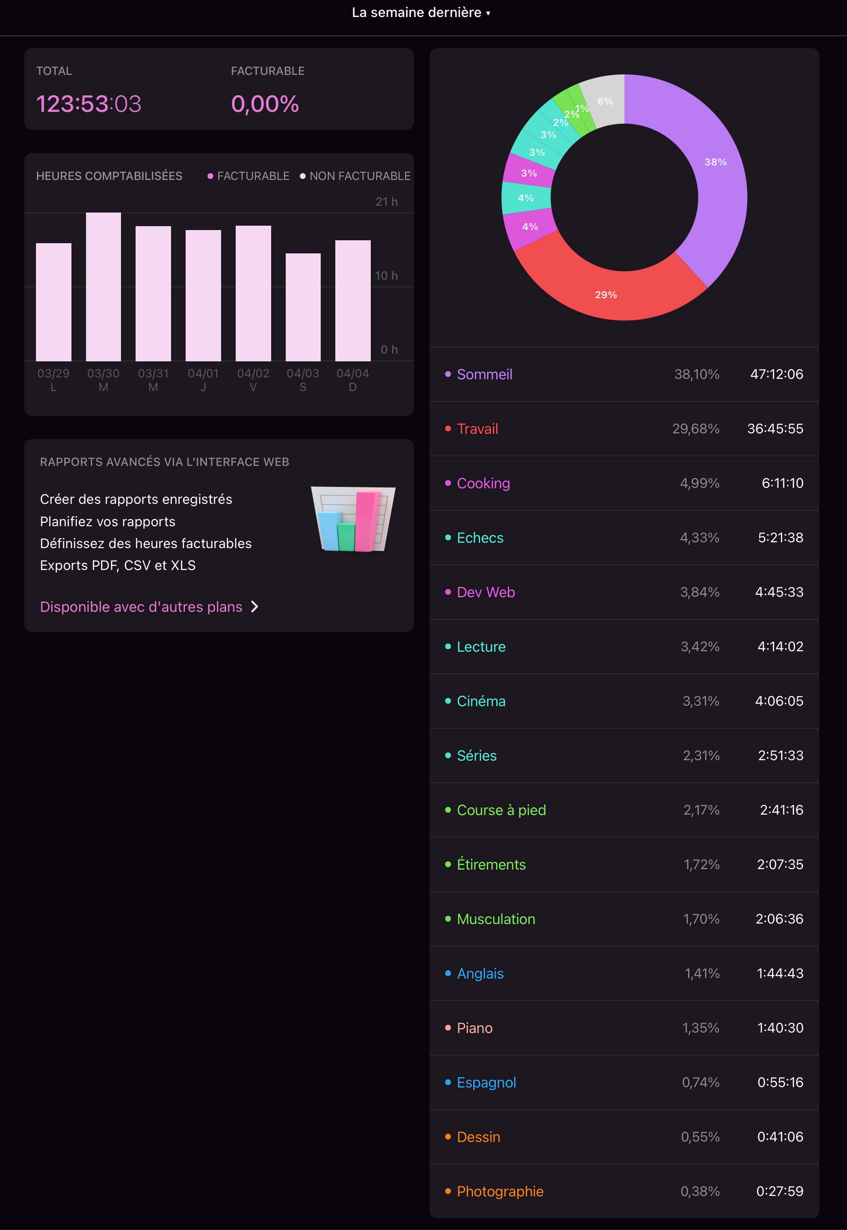 Pas réellement besoin de passer sur les versions payantes, la version gratuite suffit amplement.(Cependant, dans mon cas j'utilise un système de points qui donne de la valeur à chaque "Activités" pour avoir un oeil sur la "qualité" de ma semaine en plus de la quantité, ce que je pourrais faire avec la version payante qui permet de donner un taux horaire aux projets, mais comme je ne m'en sers que de façon hebdomadaire, ça me prend que 2min sur un tableur.)