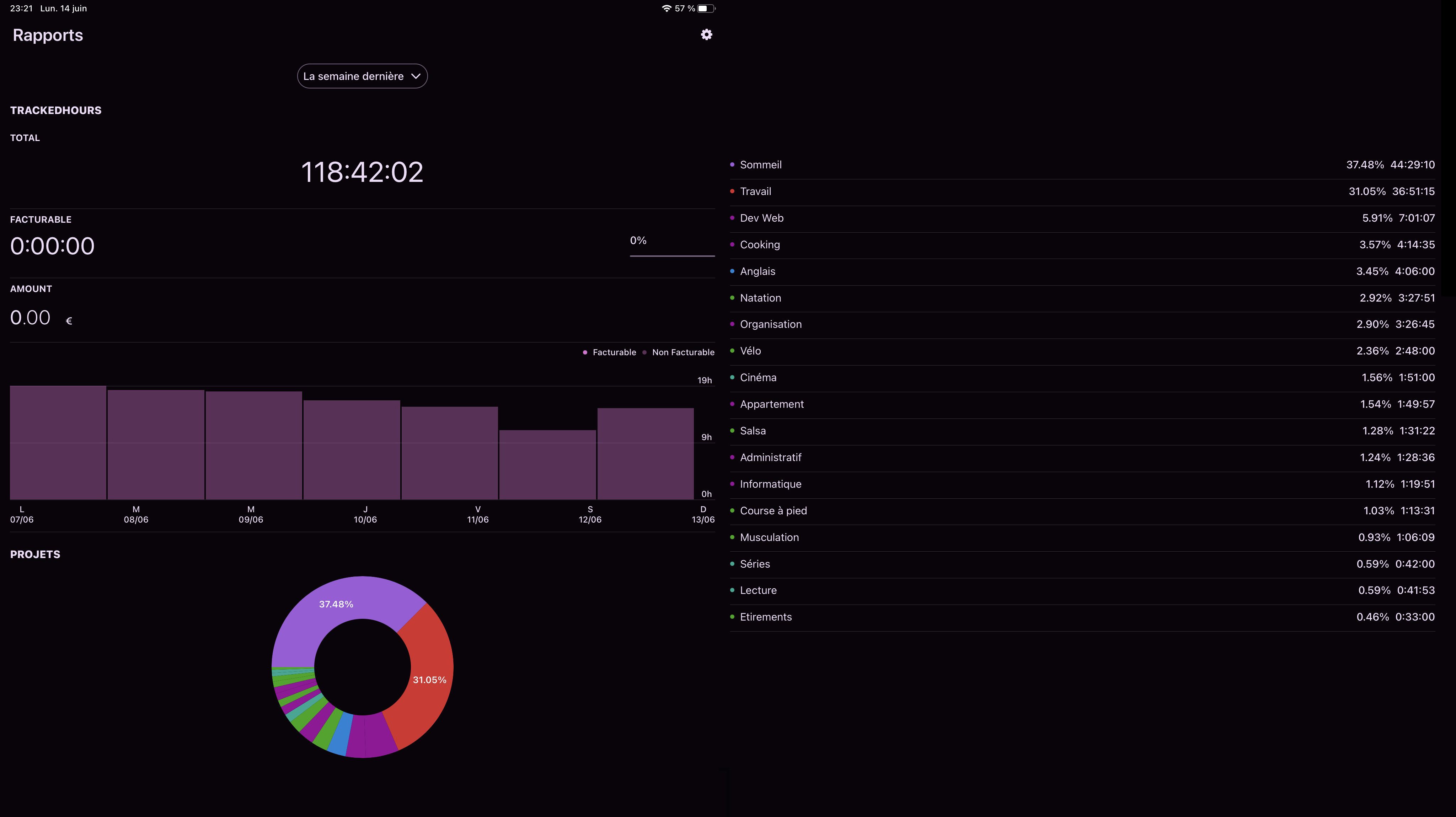 Pas mal d'avancée. Je ne remplis pas les objectifs au jour le jour mais sur la semaine ils sont largement atteint. Pour l'écriture par exemple j'ai écris 4h hier, ce qui compense les autres jours ou j'ai pas écris.
