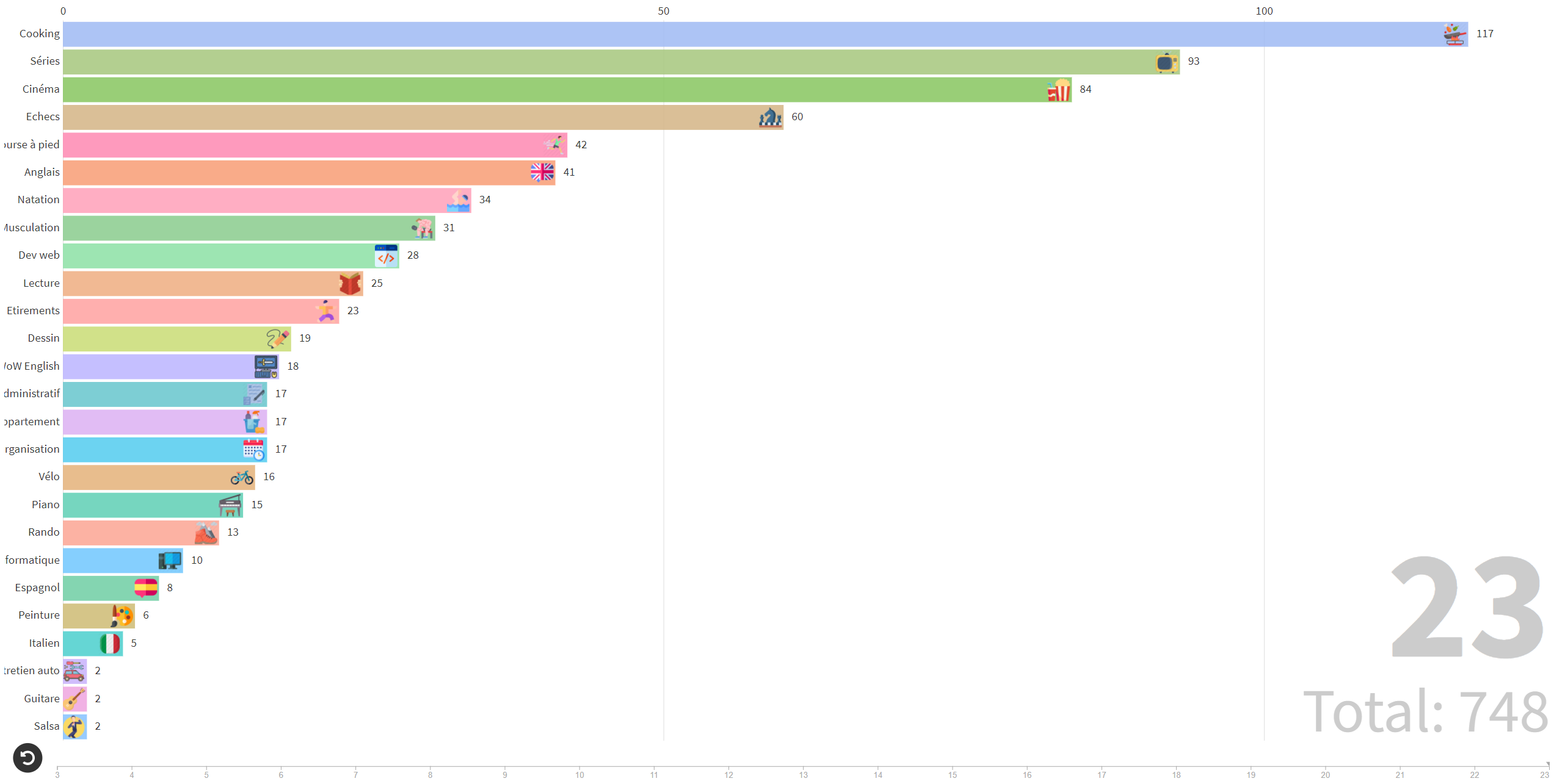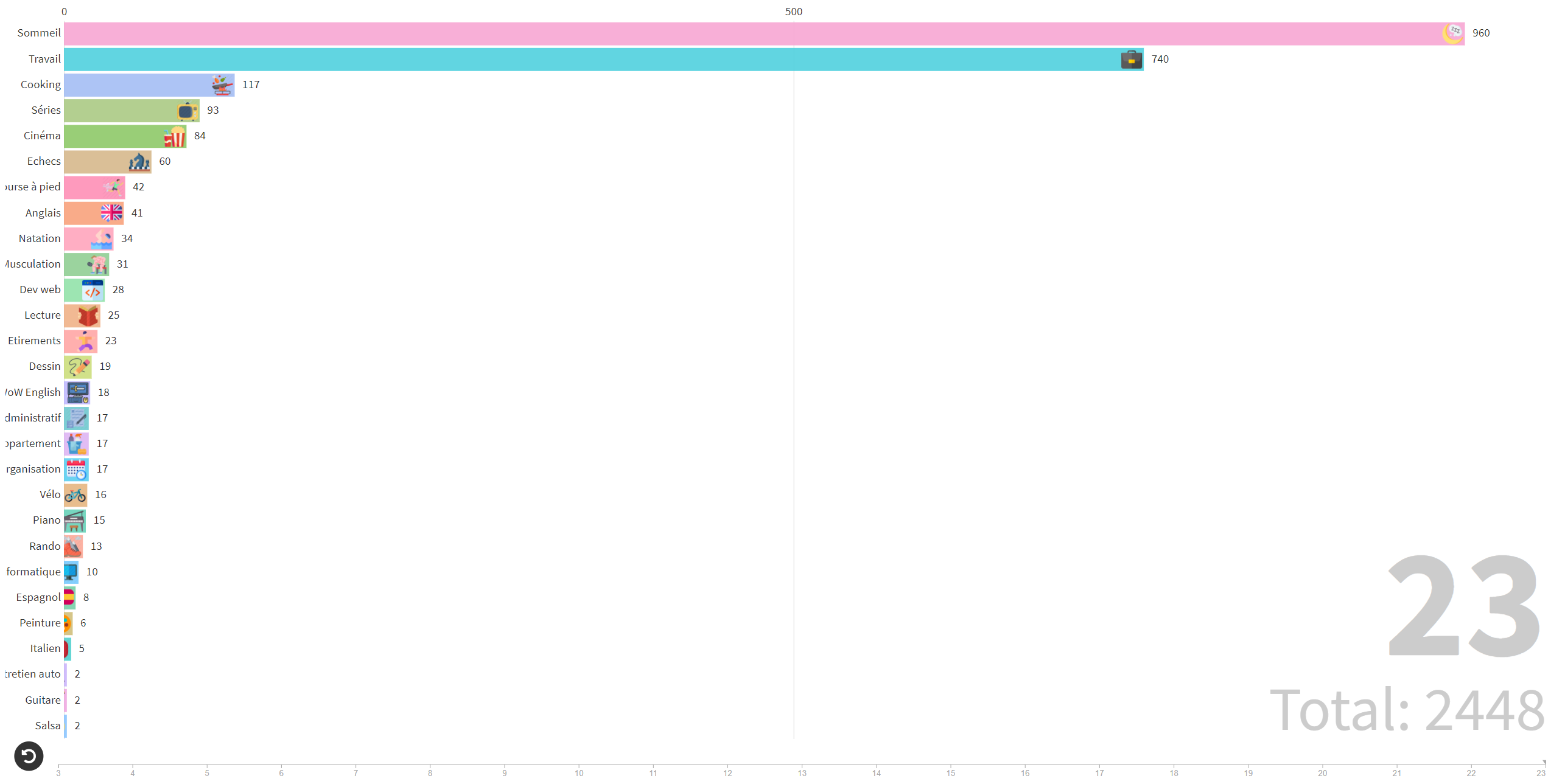 Lien de l'anim: https://preview.flourish.studio/6473171/iAm8a5VPzX9JyT3y4H2Vna_qZVC9GrBQYvENdvUOjl9w9EBHyQdiIGbUKqbrDNoB/Bar chart race sans le travail & le sommeil, seulement les activités: