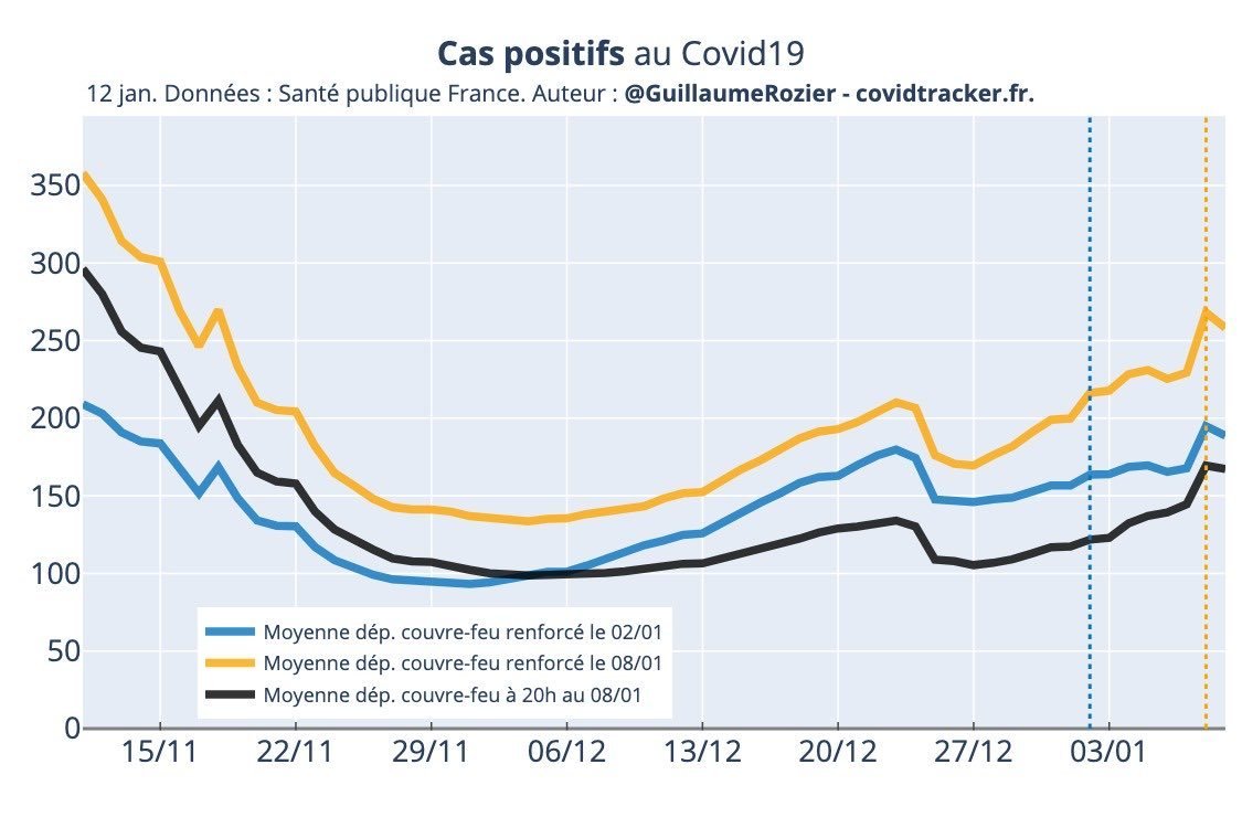 La courbe bleue montre une pente très atténuée dès le 2 janvier, date d'instauration du couvre-feu à 18 heures par rapport à celles des aux autres départements dont l'heure du couvre-feu était alors fixée à 20 heures.