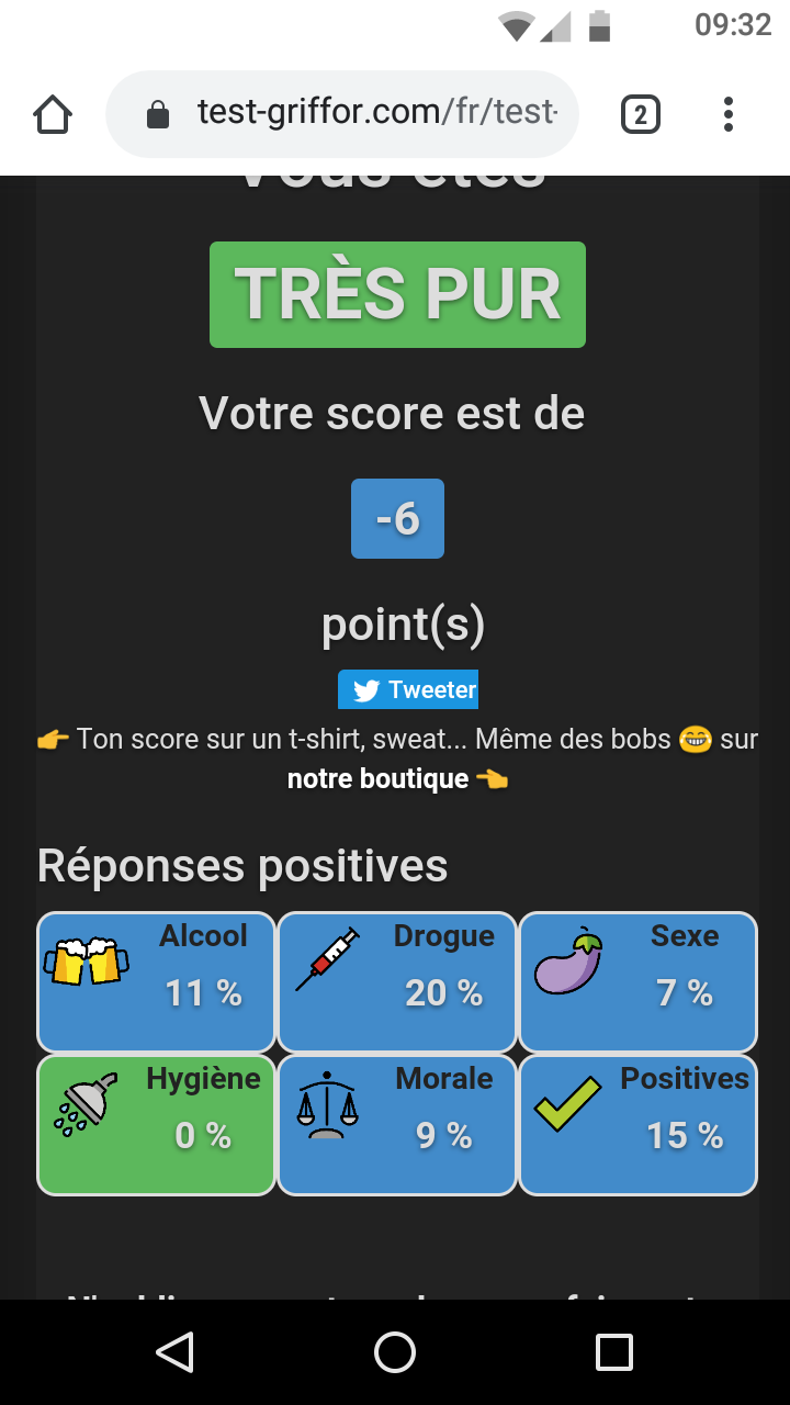 Mon score est de 119, alcool 53%, drogue 40%, sexe 35%, hygiène 30%, morale 21%, positives 39%, je suis impur et mon score est juste un peu supérieur à la moyenne qui est de 109, je n'ai pas à rougir de qui que ce soit et tout ce qu'on peut dire c'est que je suis sorti de chez moi quelques fois