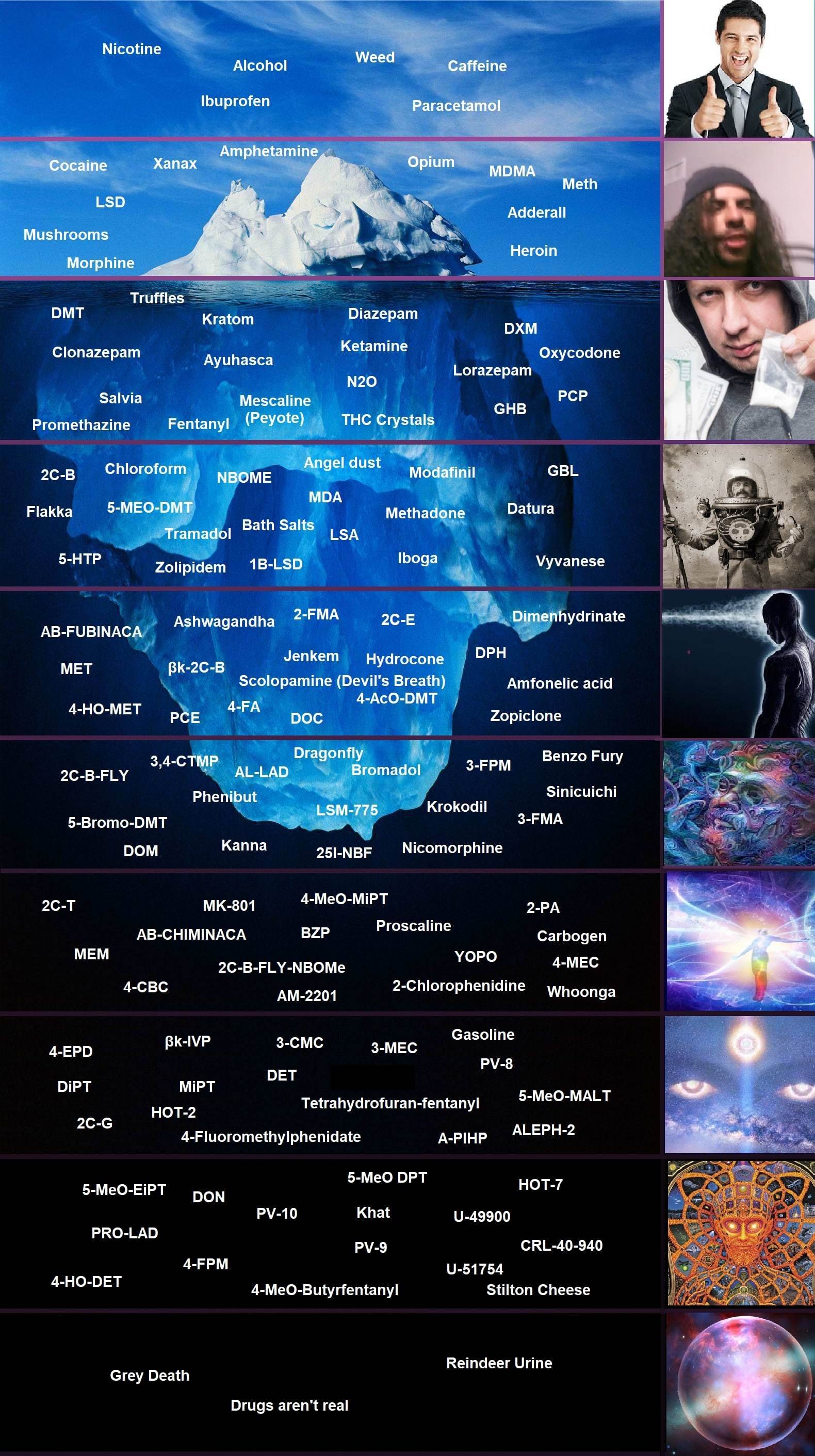 Perso j'ai testé : Alcool, Nicotine, Weed, Caféine, Paracetamol, ibuprofène, LSD, Morphine, Champignon, Opium, DXM, Datura et l'essence