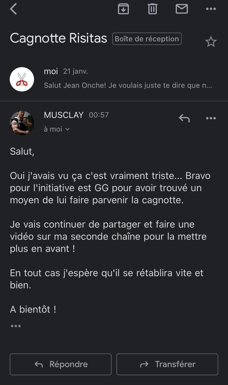 J'ai aussi reçu un petit message de son entourage (je les avais remercié pour la vidéo, annoncé que la cagnotte venait de franchir les 3000€ et j'avais également demandé s'ils avaient des infos concernant l'idée du fauteuil électrique)