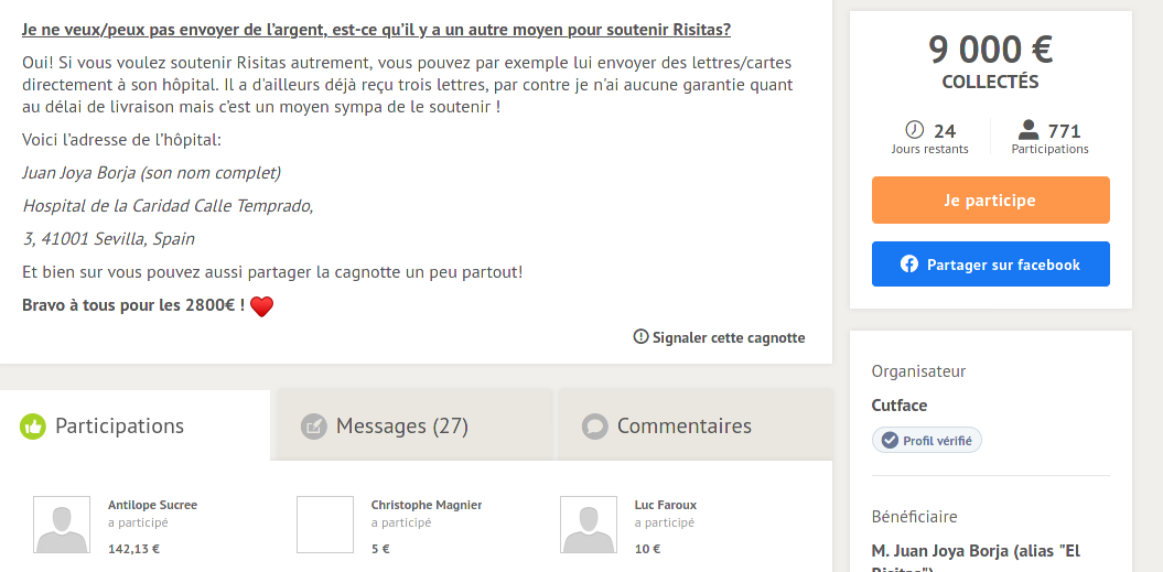 Quelle surprise en ouvrant le Ouest-France d'y voir la cagnotte relayéehttps://www.ouest-france.fr/high-tech/internet/la-star-du-web-el-risitas-est-gravement-malade-une-cagnotte-en-ligne-est-ouverte-pour-le-soutenir-7131459
