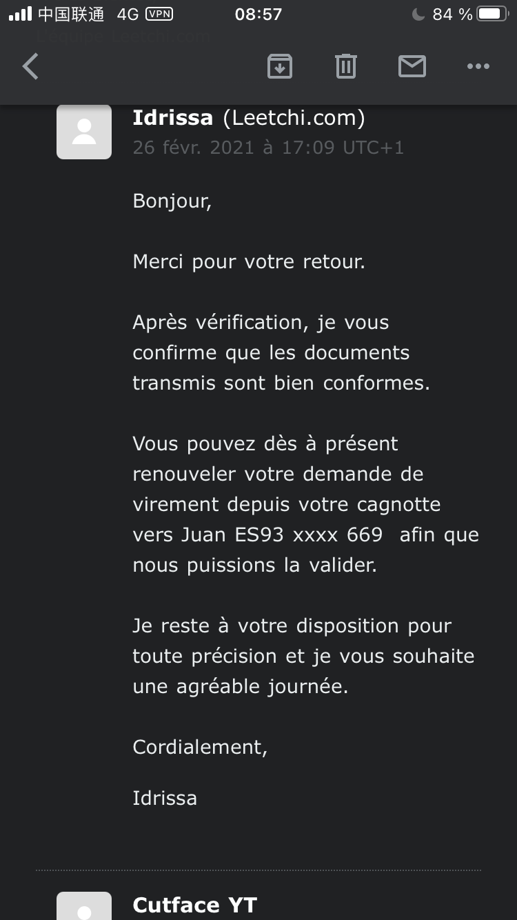 Aya non je ne reçois pas l'argent, j'ai juste transmis moi même les documents de Risitas à Leetchi (j'ai le privilège d'avoir vu sa carte d'identité