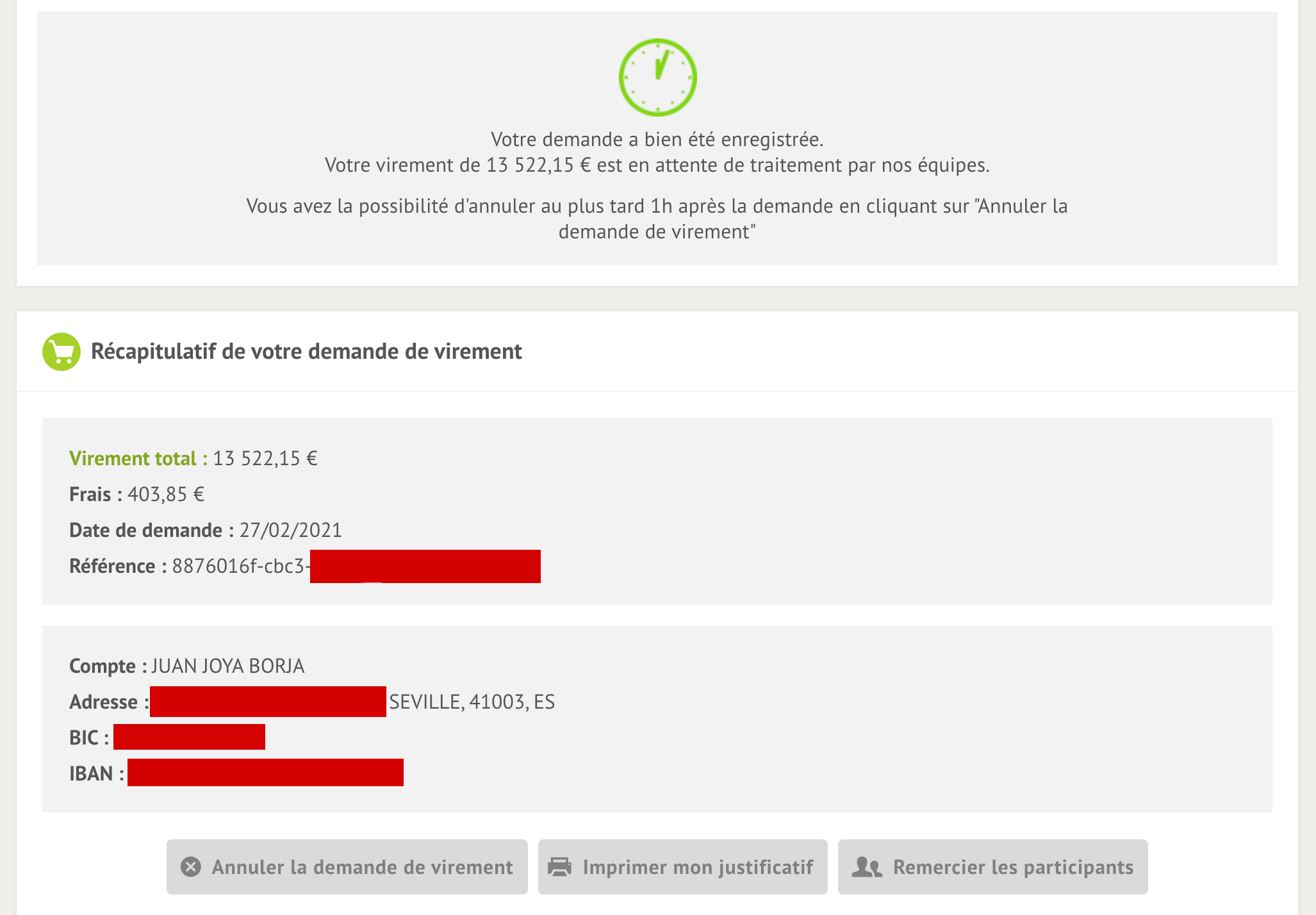 C'est bon! Je viens d'effectuer la demande de virement!Risitas recevra donc un montant total de 13.522,15€