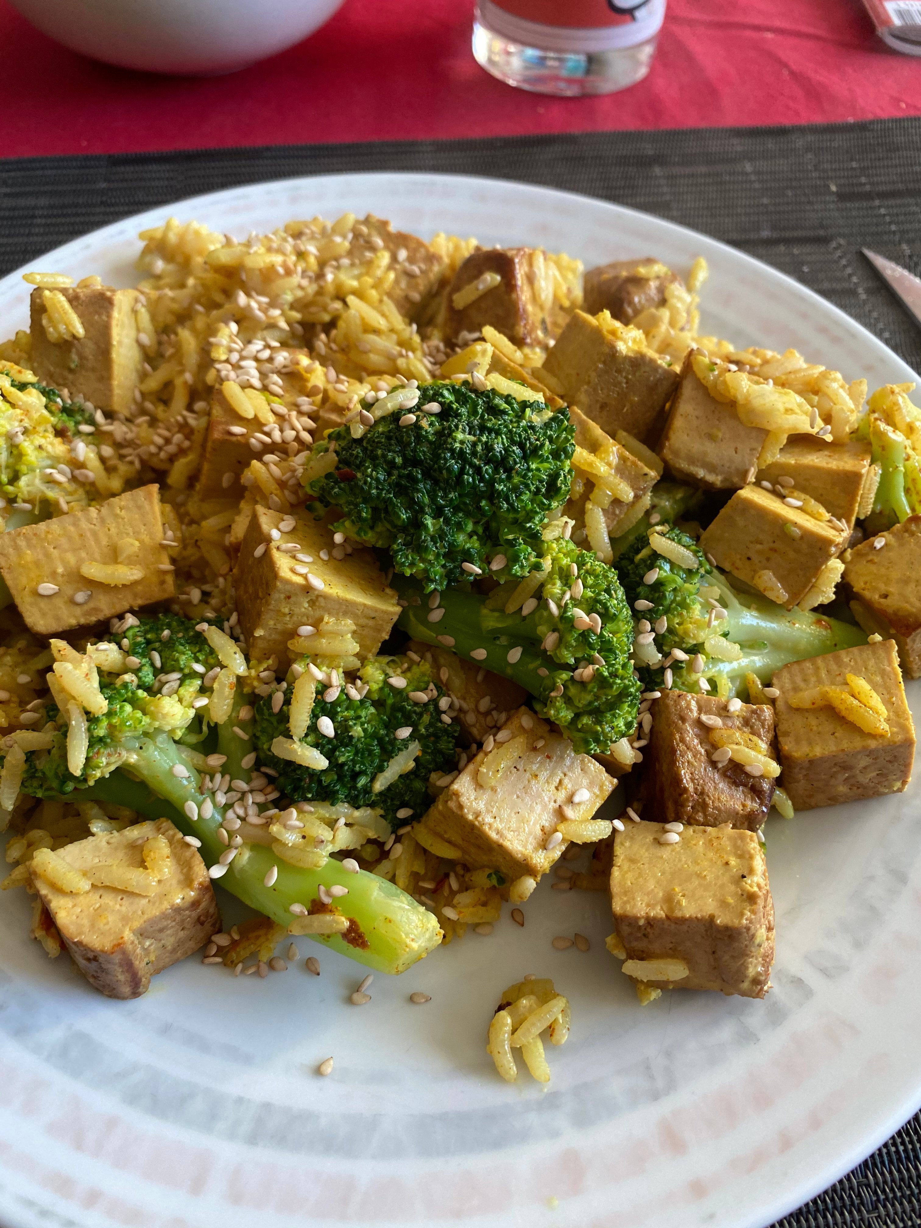 Riz complet - Tofu fumé - Brocolis - Graine de sesame - Creme fraîche soja - Curcuma / Poivre / Piment doux / Sel enjoy