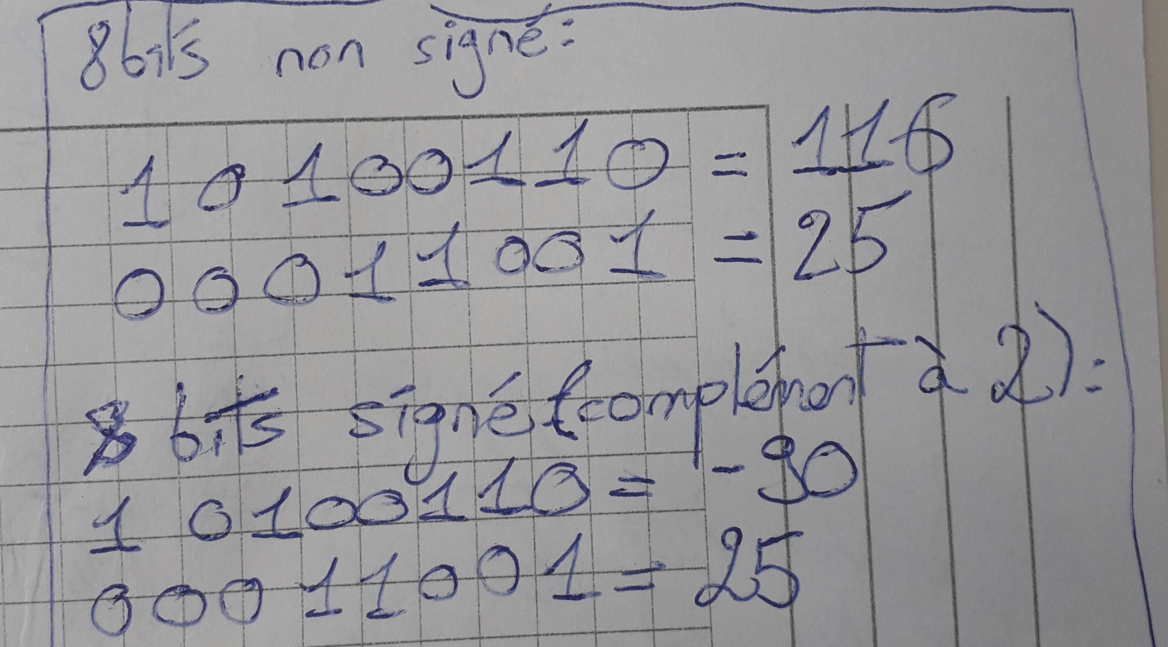 Ici, tu vois la représentation 8 bits du nombre 00011001 en version signée et en version non signée. Puisque c'est un nombre positif c'est la meme chose (25).Par contre, le nombre 8 bits 10100110 ne donne pas le résultat en version signée et en version non signée.